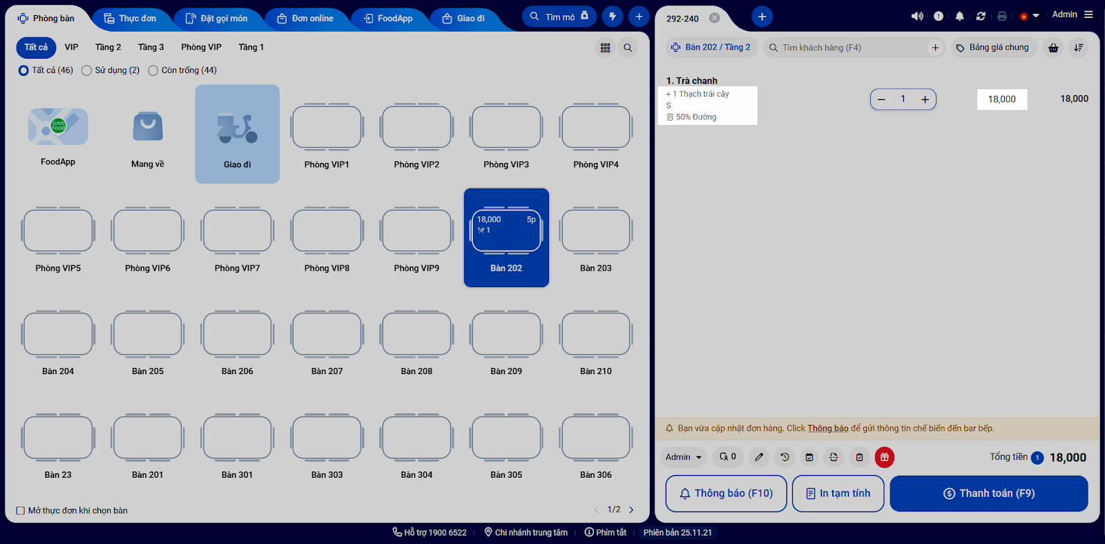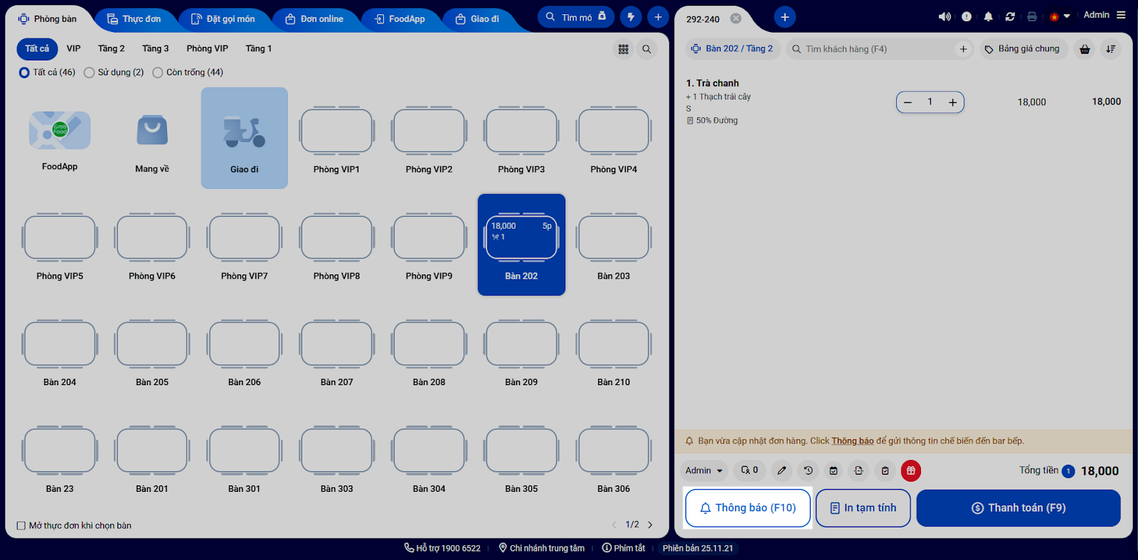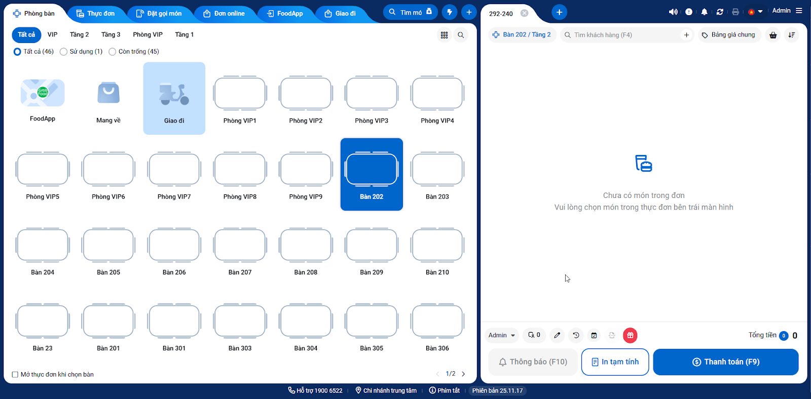 - Trên màn hình Thu ngân, bạn chọn bàn đang còn trống mà khách hàng đang ngồi (ví dụ: Bàn 202).