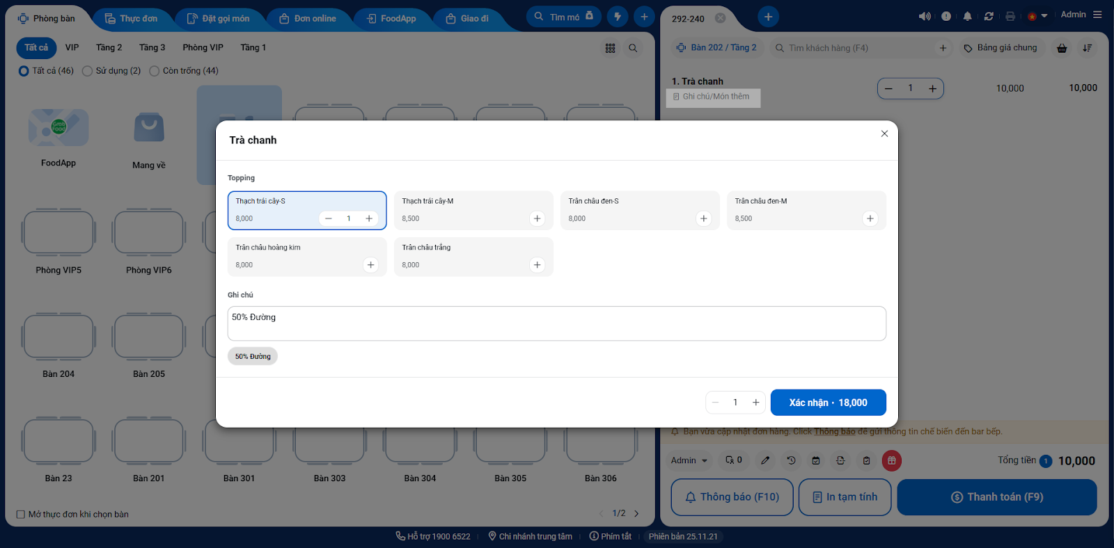 - Một cửa sổ tùy chỉnh sẽ hiện ra. Tại đây, bạn dễ dàng chọn các yêu cầu của khách trong danh sách (ví dụ: topping tàu hũ và ghi chú 50% đường, 50% đá).