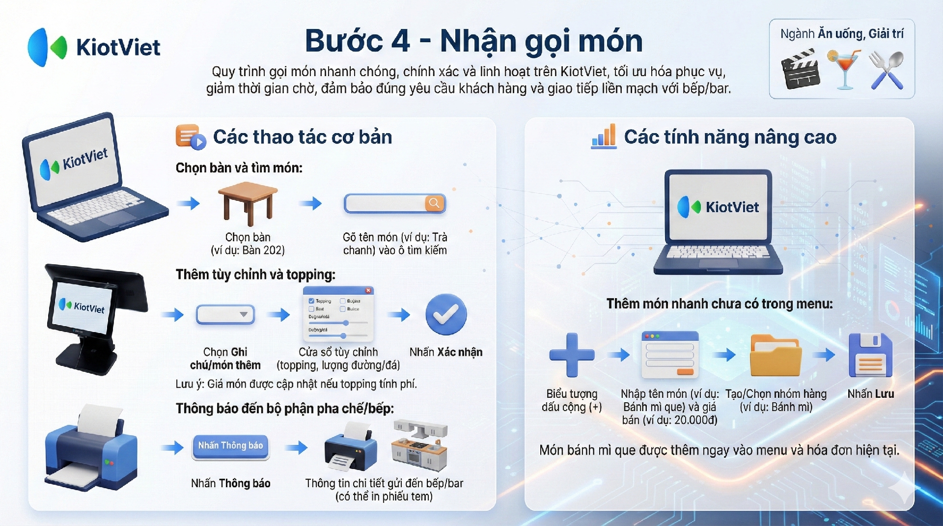 Quy trình gọi món là hoạt động cốt lõi và diễn ra liên tục tại mọi quán cà phê, nhà hàng. Một quy trình nhanh chóng, chính xác và linh hoạt là yếu tố quyết định đến sự hài lòng của khách hàng. Trên KiotViet, tính năng nhận gọi món được thiết kế để xử lý linh hoạt các yêu cầu phức tạp, đảm bảo sự chính xác và hiệu quả trong ngành Ăn uống, Giải trí.
