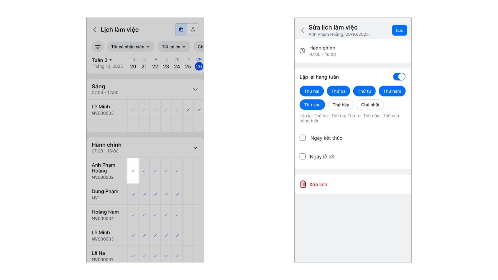 - Quản lý lịch làm việc linh hoạt: Dễ dàng tạo ca làm việc, đặt lịch cho từng nhân viên hoặc phòng ban, hỗ trợ đặt lịch lặp lại hàng ngày, hàng tuần.