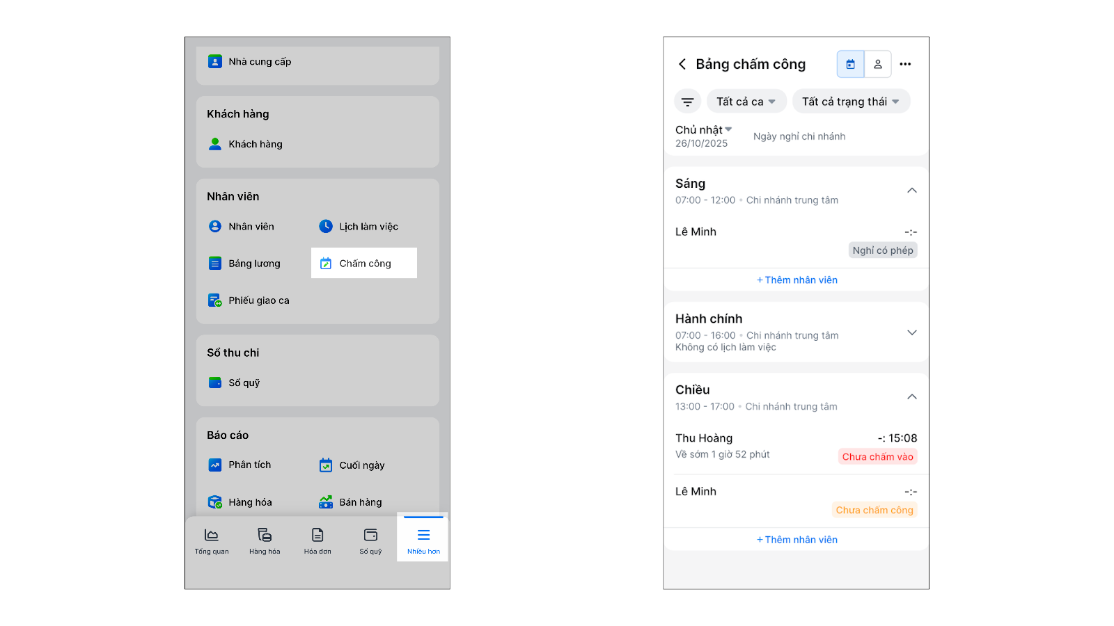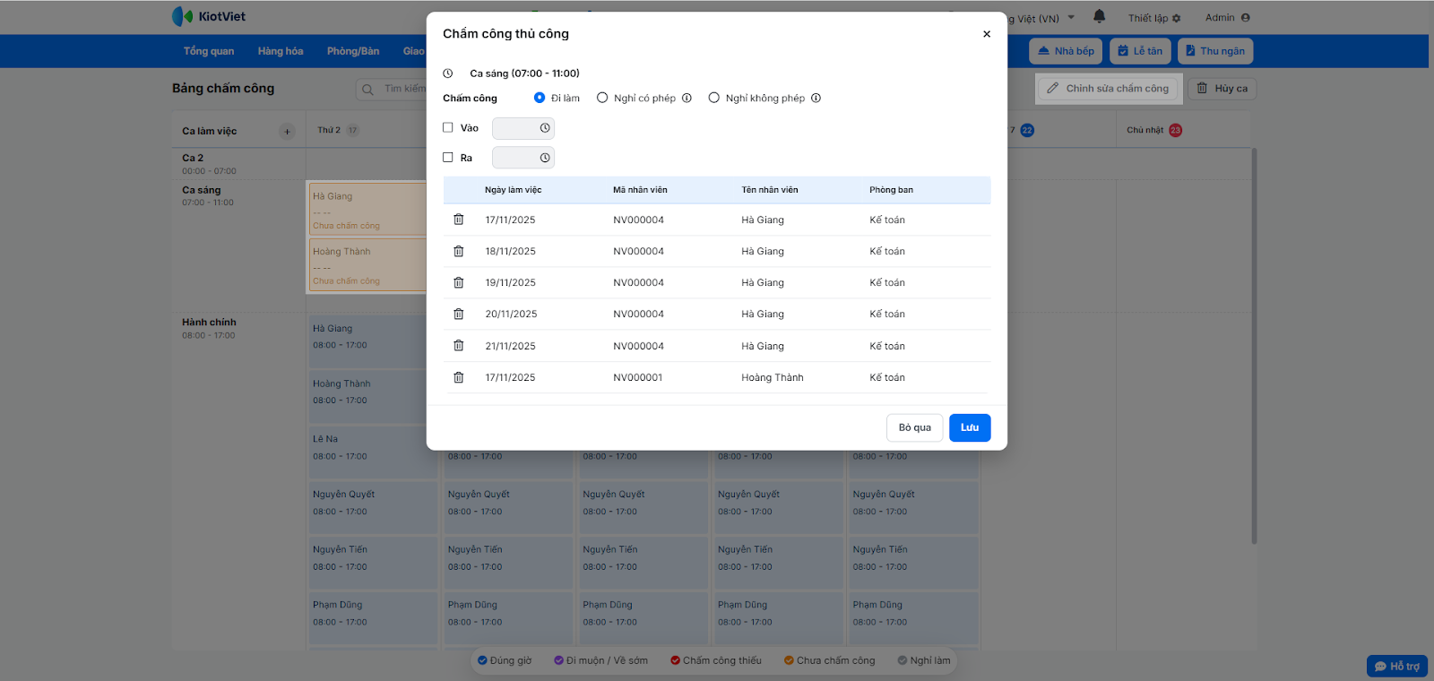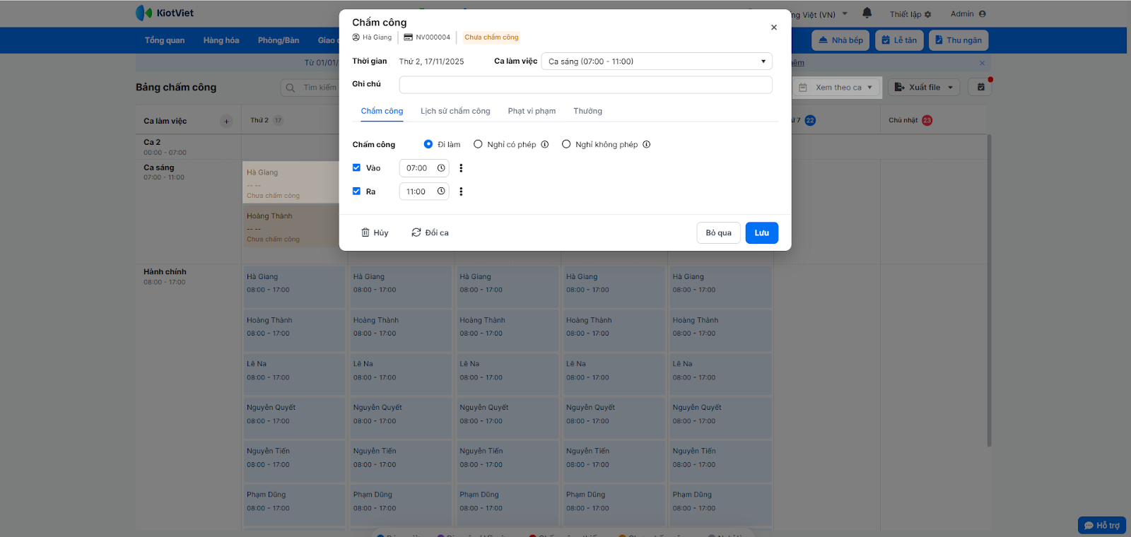- Chấm công chi tiết từng ca: