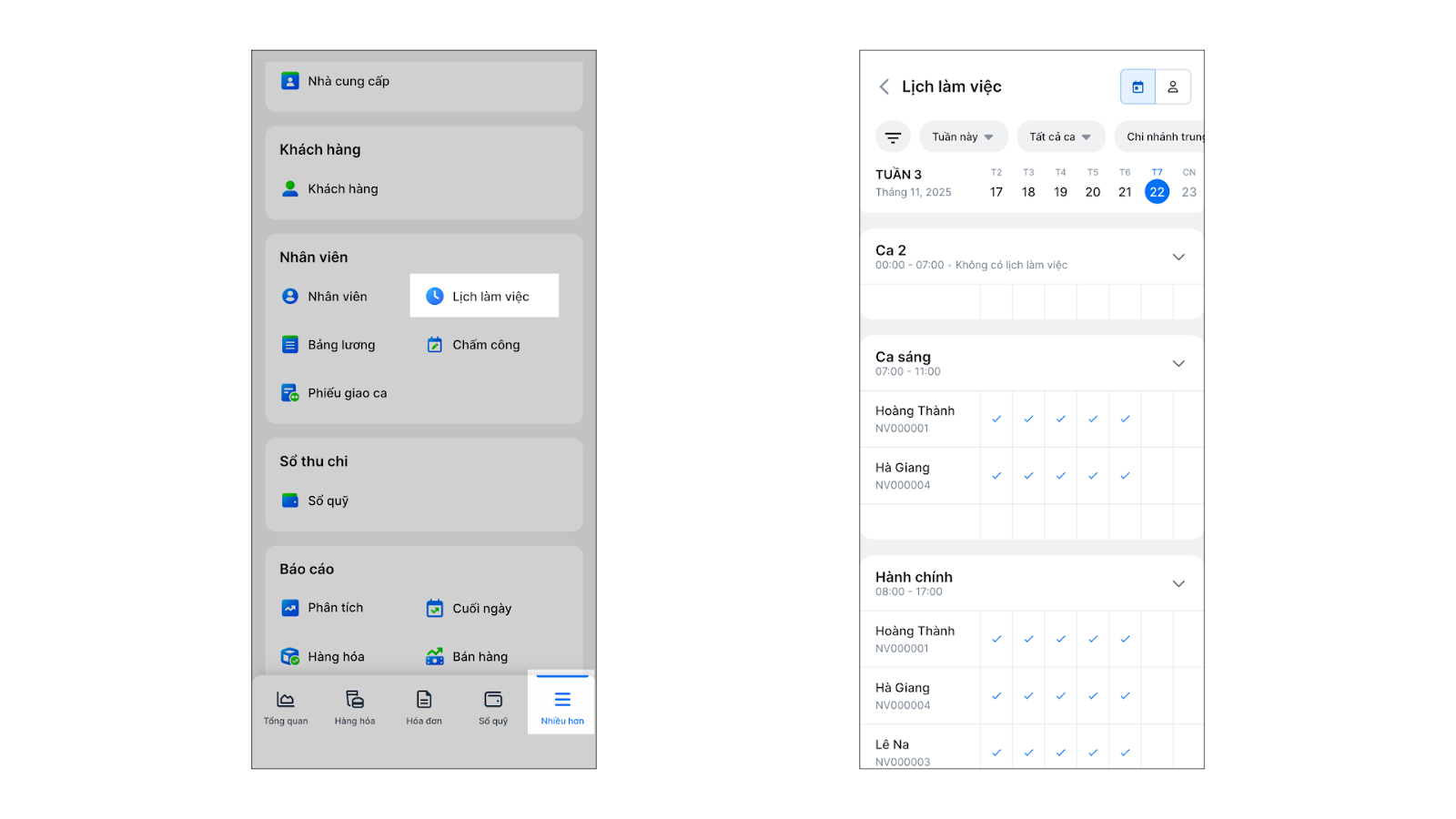 - Tình huống: Bạn cần xem lịch làm việc, bảng chấm công của nhân viên hoặc kiểm tra chi tiết giờ vào/ra của một ca làm việc cụ thể trên điện thoại.