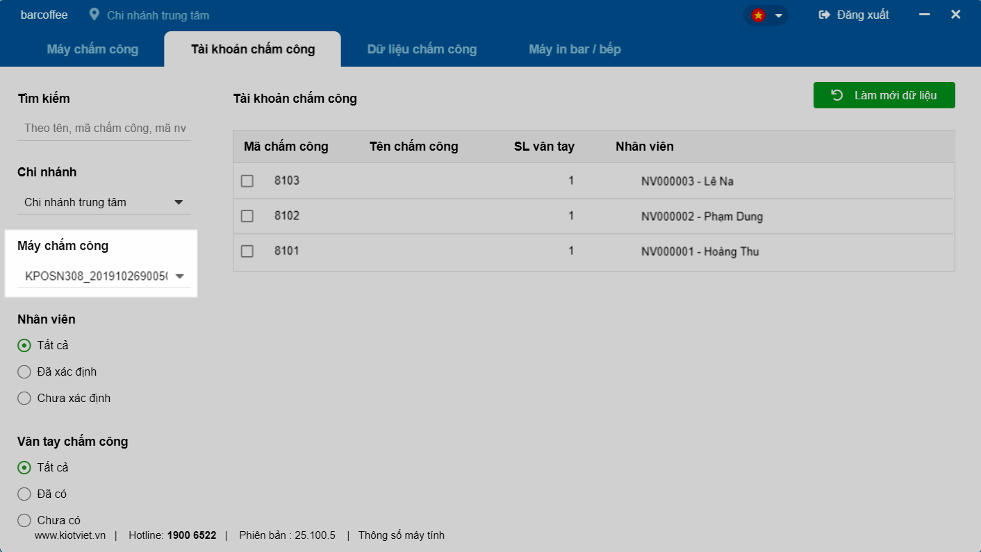 - Danh sách các tài khoản (vân tay/thẻ…) trên máy sẽ hiển thị. Tại cột Nhân viên, bạn cần chọn đúng nhân viên KiotViet tương ứng với từng Mã chấm công trên máy. Nhấn Làm mới dữ liệu nếu cần cập nhật.