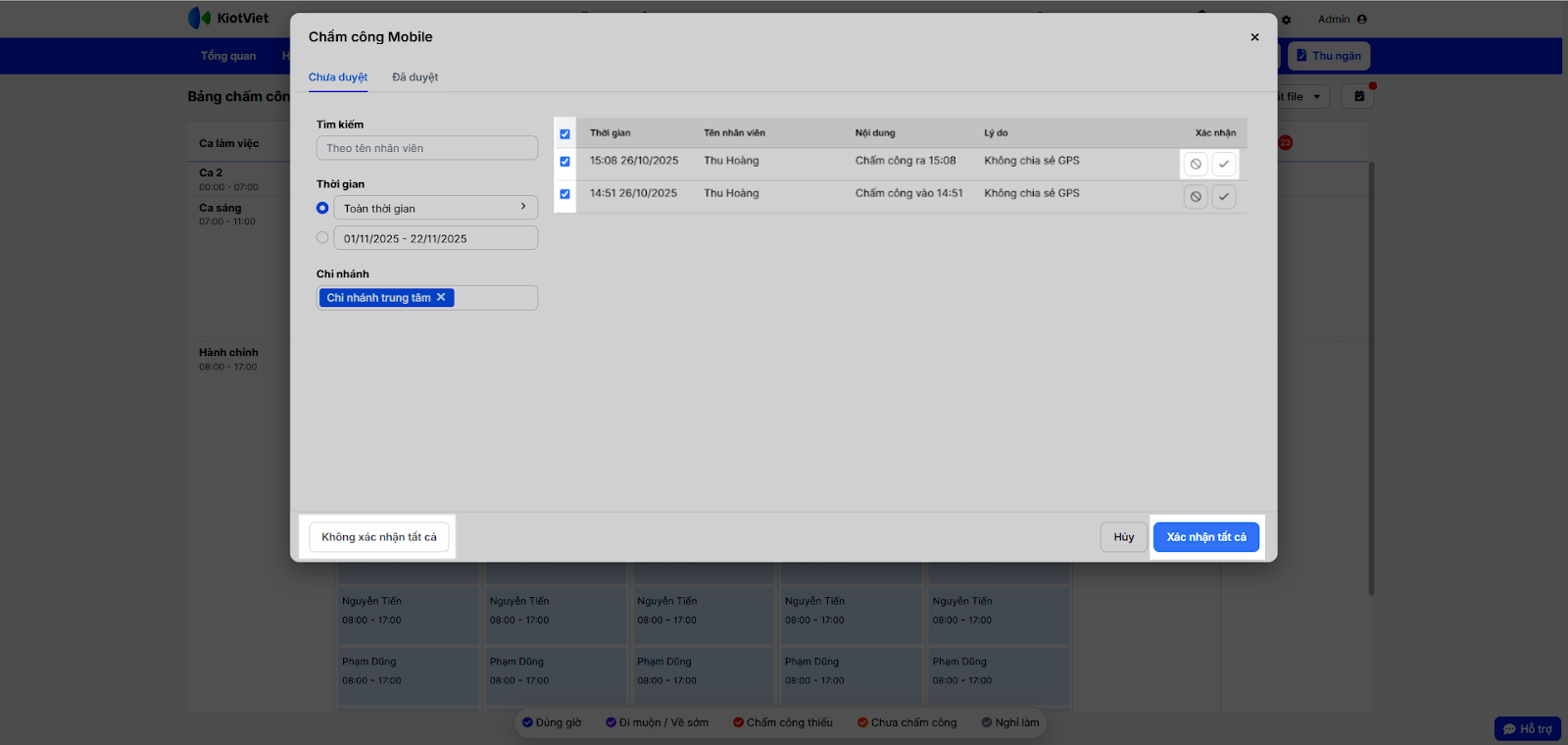- Danh sách các lượt chấm công cần xác nhận sẽ hiển thị. Bạn xác nhận/ không xác nhận từng lượt chấm công hoặc tích chọn các lượt hợp lệ và nhấn Xác nhận tất cả hoặc Không xác nhận tất cả.