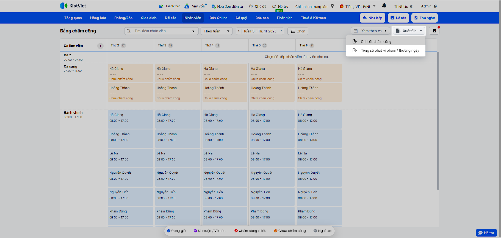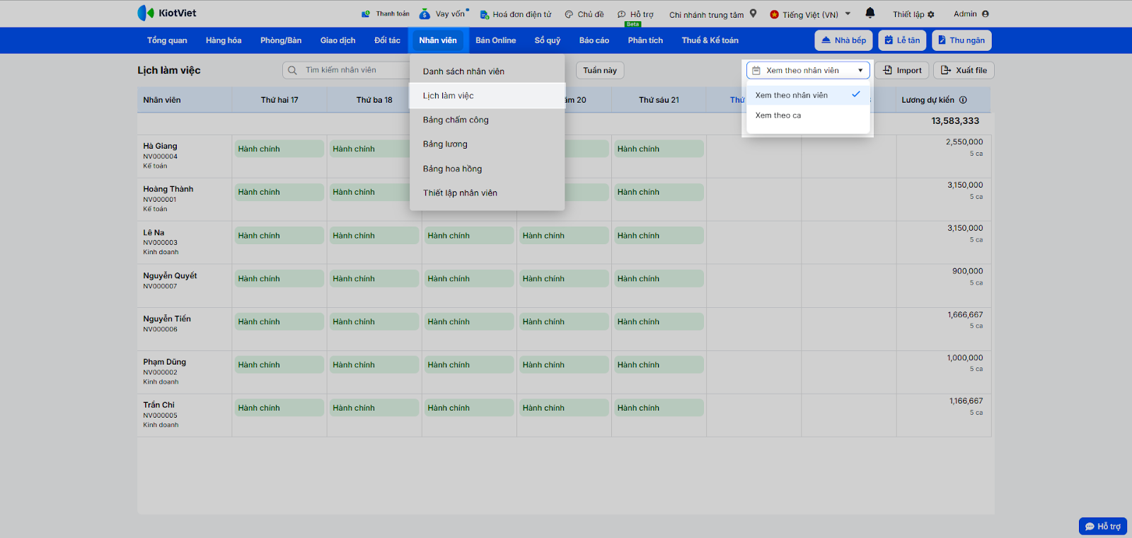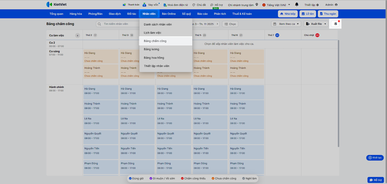 - Chọn kiểu hiển thị: Xem theo nhân viên hoặc Xem theo ca.
