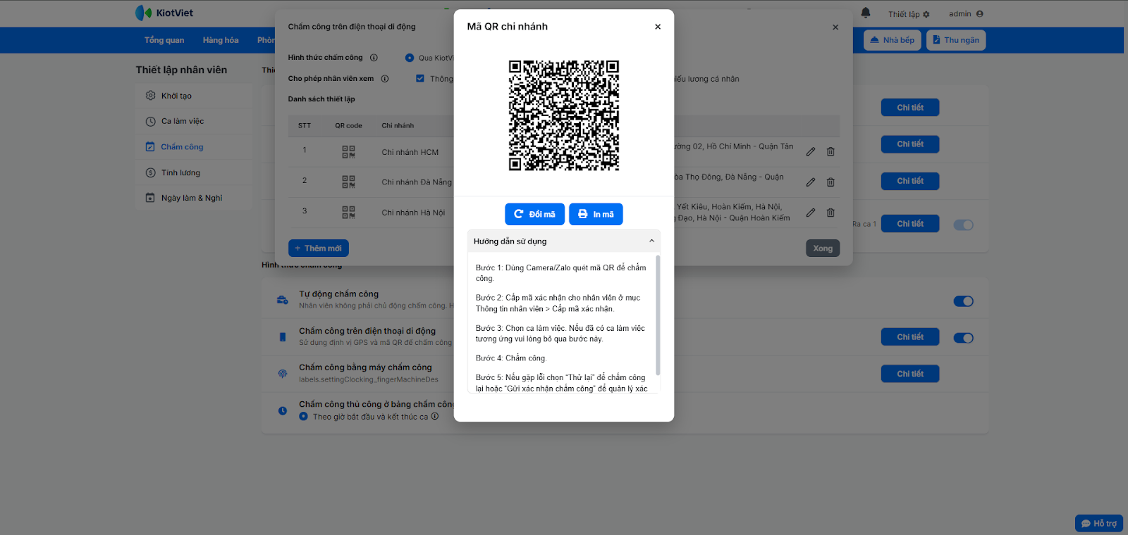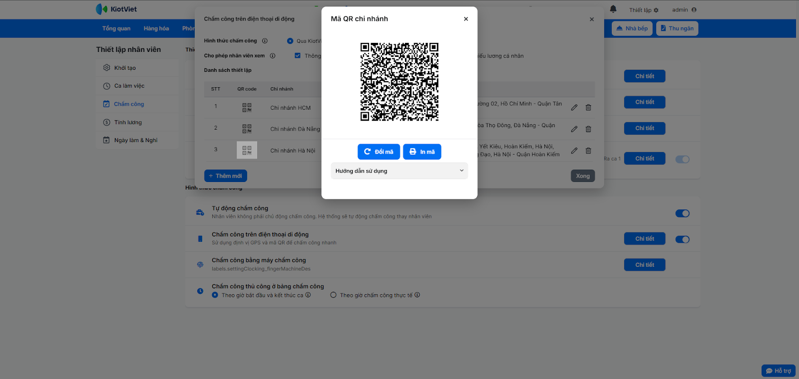 - Hệ thống tự động tạo mã QR cho từng chi nhánh, bạn nhấn vào biểu tượng QR để In mã, Đổi mã và xem Hướng dẫn sử dụng tính năng.