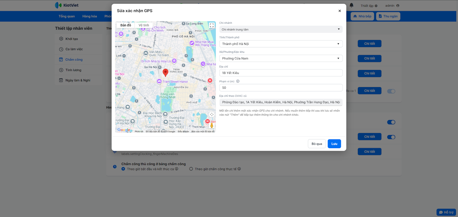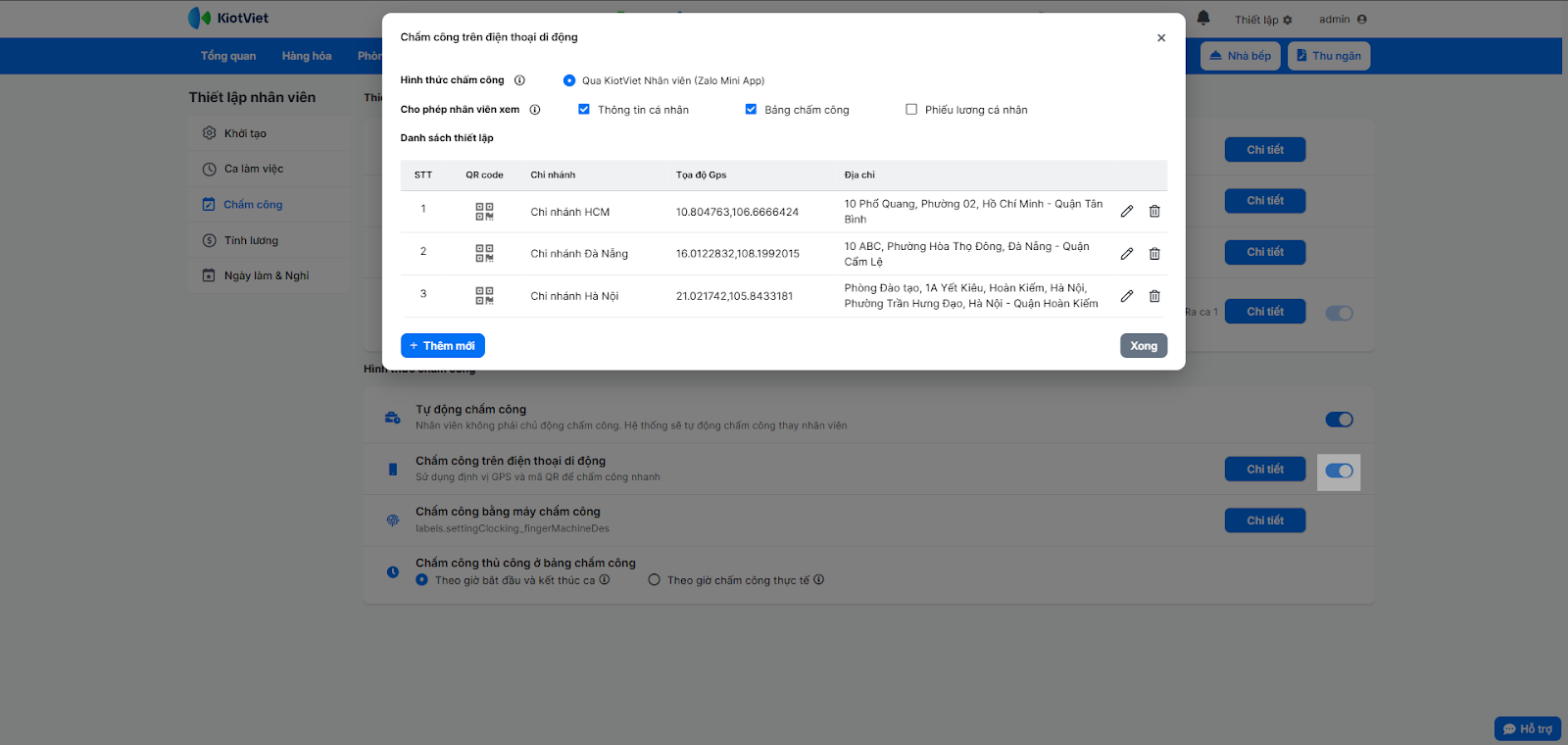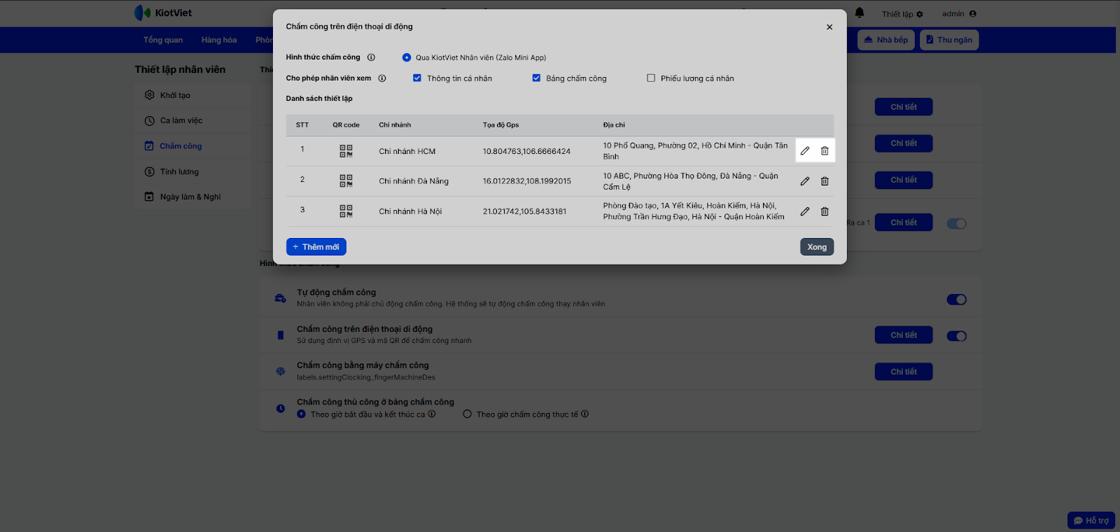 - Ngoài ra, bạn có thể chỉnh sửa (bằng cách nhấn biểu tượng cây bút) hoặc xóa (nhấn biểu tượng thùng rác) xác nhận vị trí chấm công cho chi nhánh.