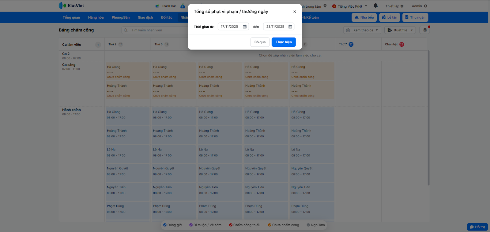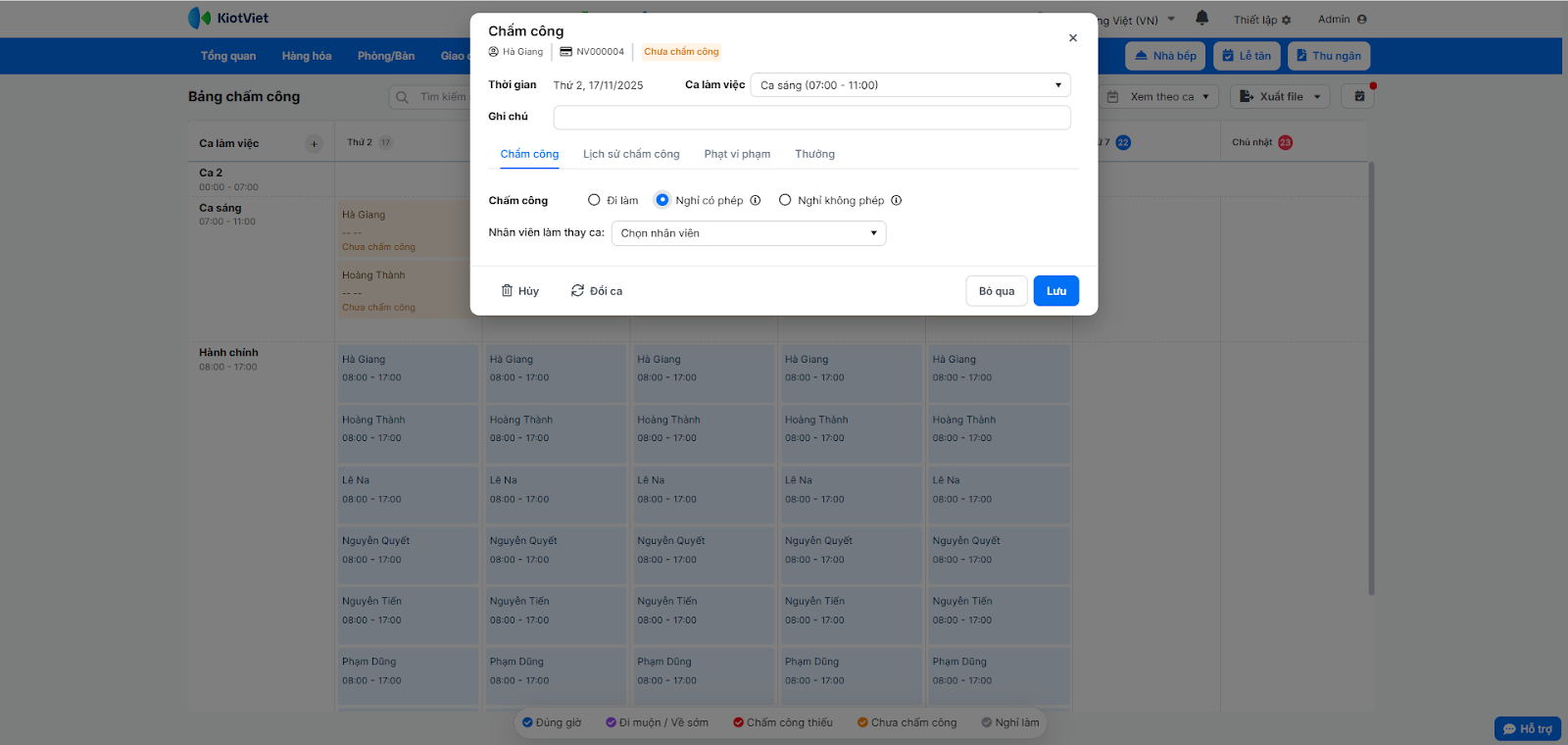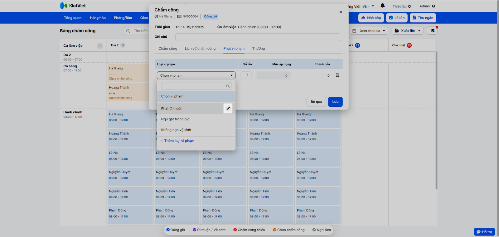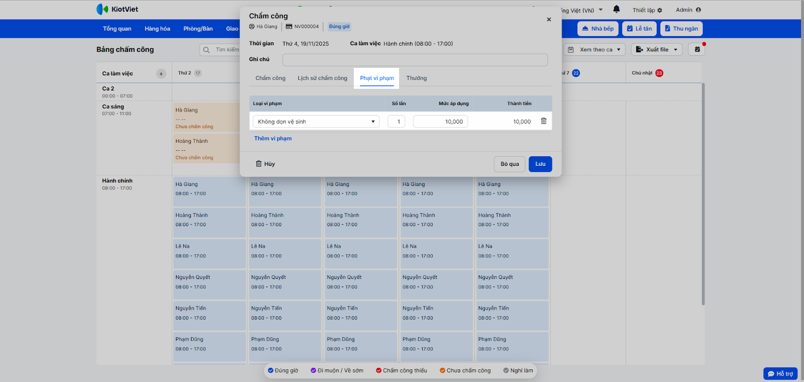 - Nhấn Lưu trên pop-up chấm công. Số tiền phạt sẽ tự động tổng hợp vào bảng lương.