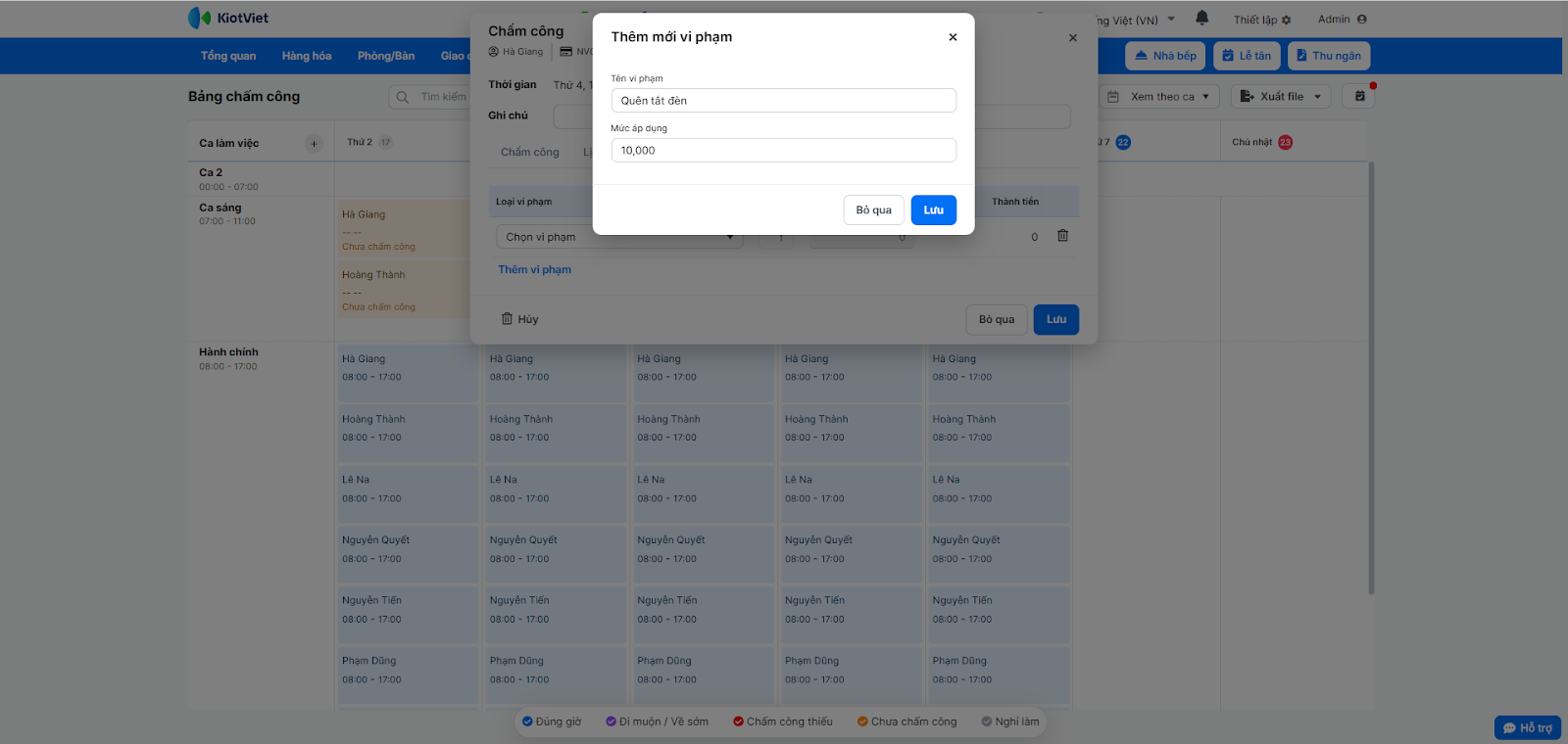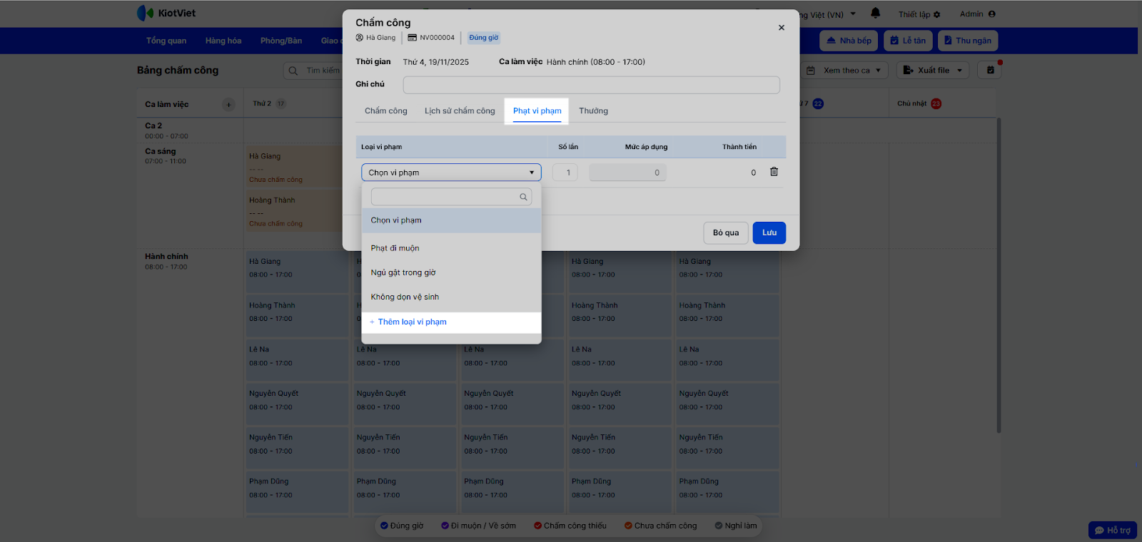 - Trong pop-up chấm công chi tiết, nhấn Thêm vi phạm.
