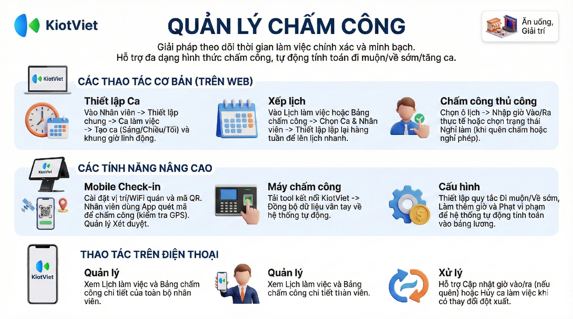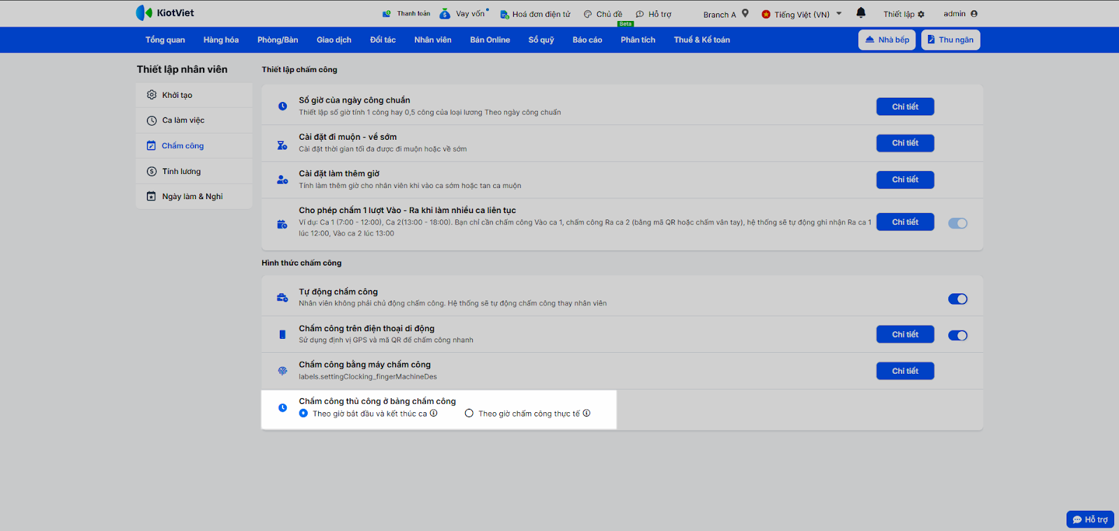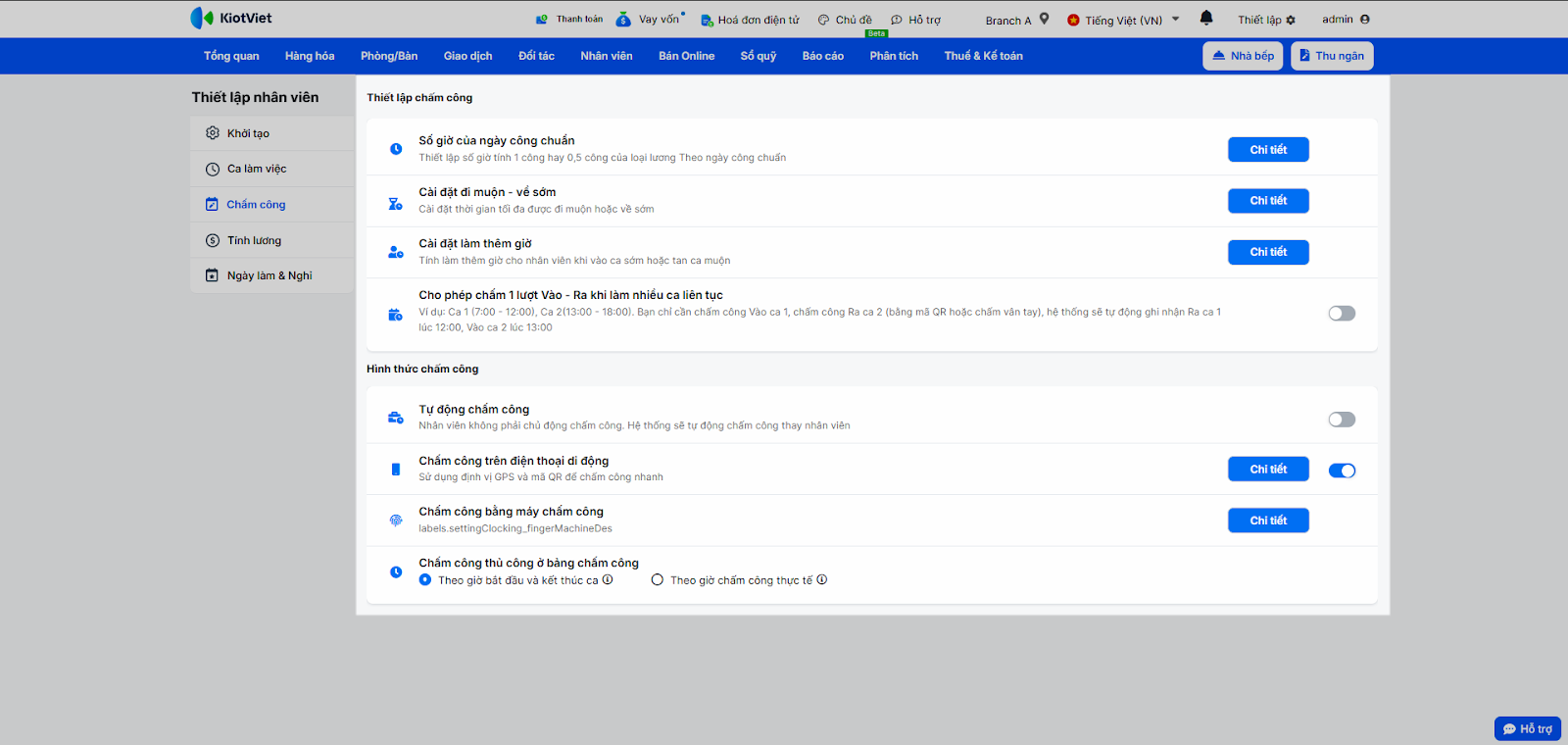 Tính năng Quản lý Chấm công trên KiotViet giúp nhà hàng/quán theo dõi và quản lý thời gian làm việc của nhân viên một cách chính xác và hiệu quả. Từ việc thiết lập ca làm việc, đặt lịch, ghi nhận giờ vào/ra, đến quản lý phạt vi phạm và tích hợp với máy chấm công, tính năng này là công cụ không thể thiếu để đảm bảo tính công bằng và là cơ sở cho việc tính lương chính xác.