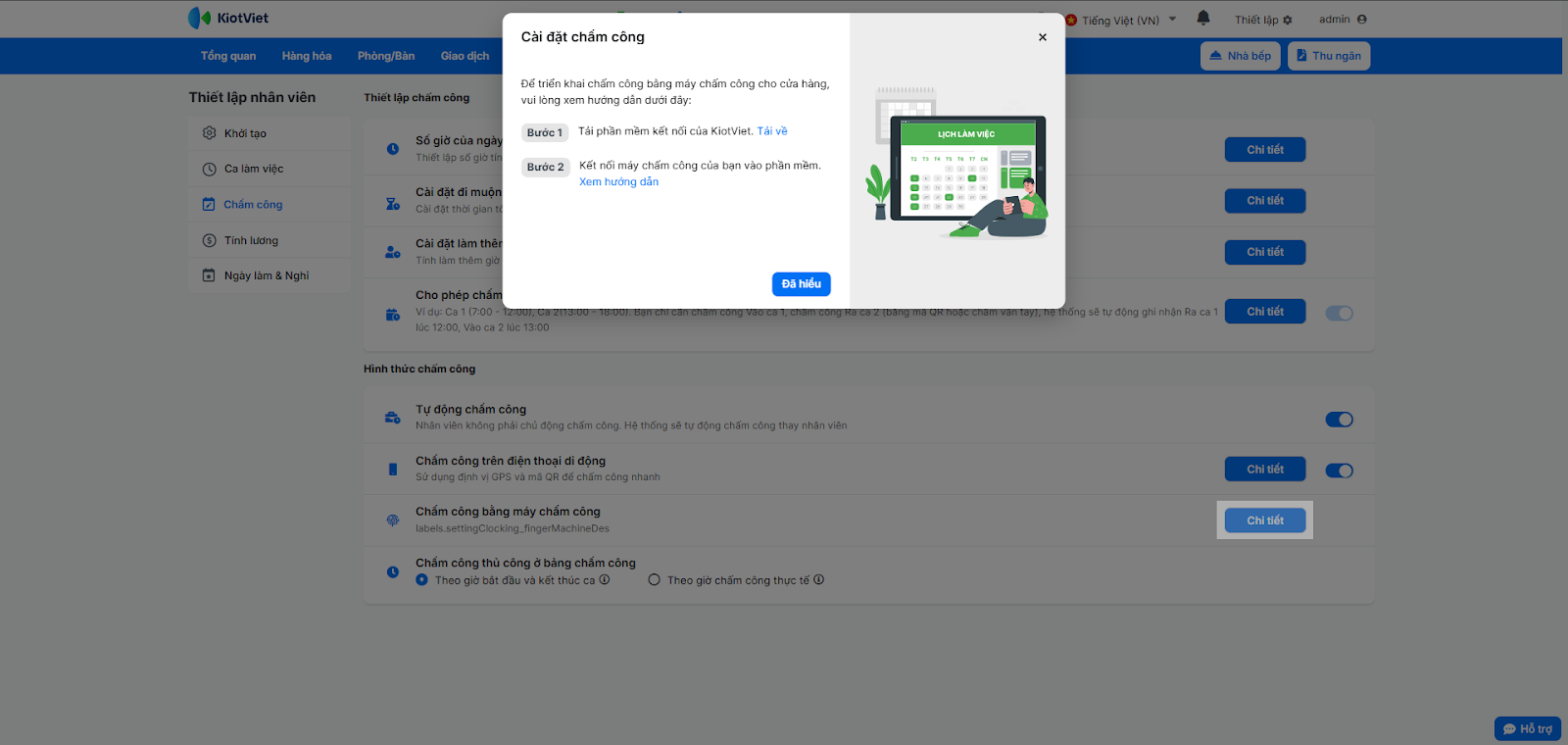- Chấm công bằng máy chấm công: Nhấn Chi tiết để xem hướng dẫn và tải phần mềm Tải phần mềm kết nối của KiotViet.