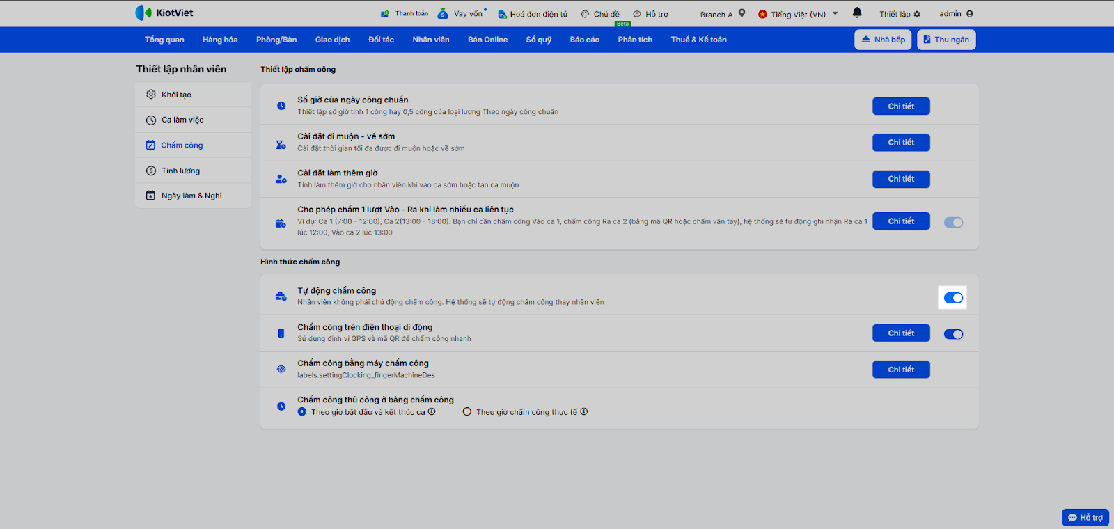 - Tự động chấm công: Nếu bật xanh, hệ thống tự động chấm công đủ giờ cho nhân viên theo lịch.