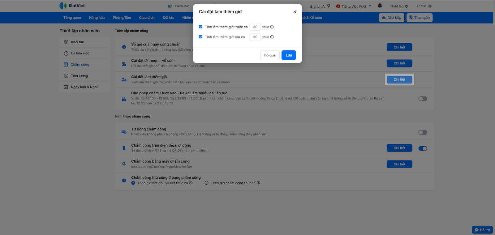 - Cài đặt làm thêm giờ: Nhấn Chi tiết, tích chọn và nhập số phút làm thêm tối thiểu trước ca/sau ca để hệ thống ghi nhận là làm thêm giờ.