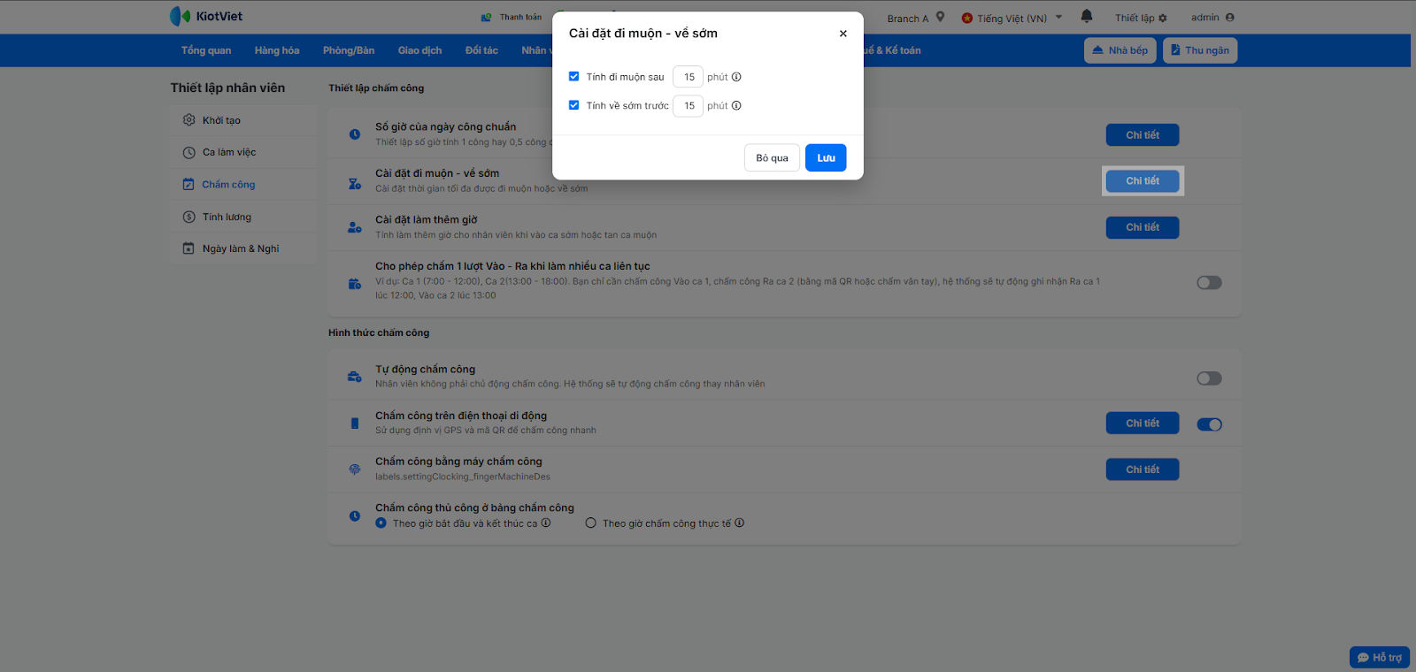 - Cài đặt đi muộn – về sớm: Nhấn Chi tiết, tích chọn và nhập số phút cho phép đi muộn/về sớm trước khi hệ thống bắt đầu tính phạt.