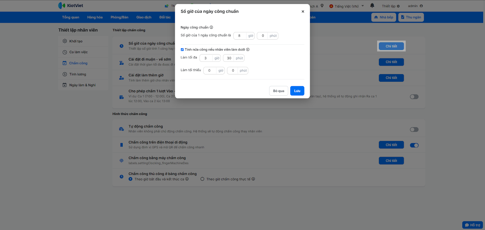 - Tích chọn Tính nửa công nếu nhân viên làm dưới (nếu cần) và điền thời gian làm việc tối đa, tối thiểu.