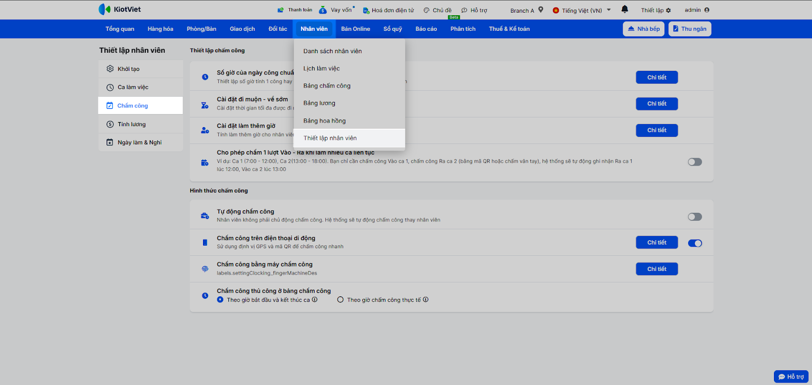 - Vào menu Nhân viên → Thiết lập nhân viên → chọn Chấm công.