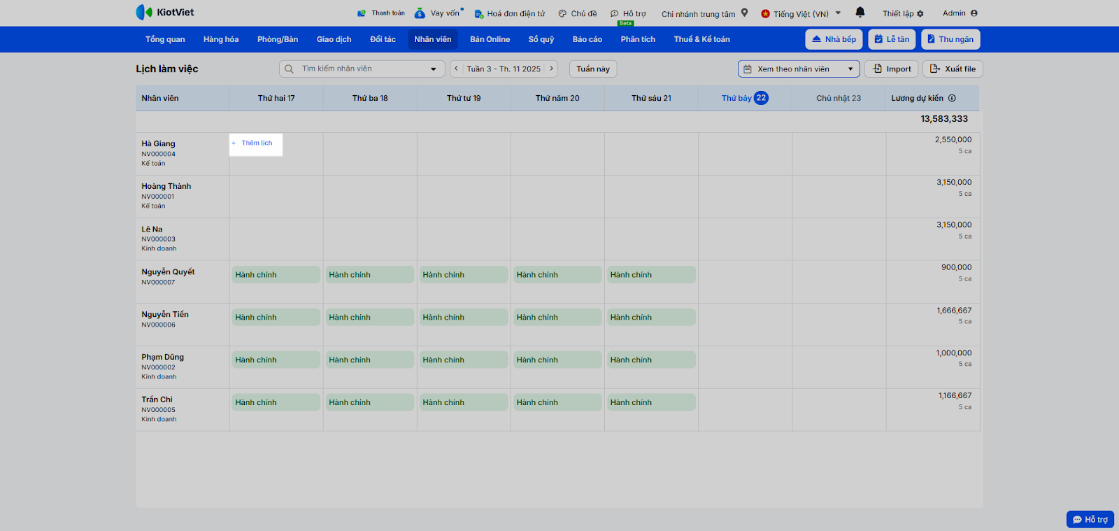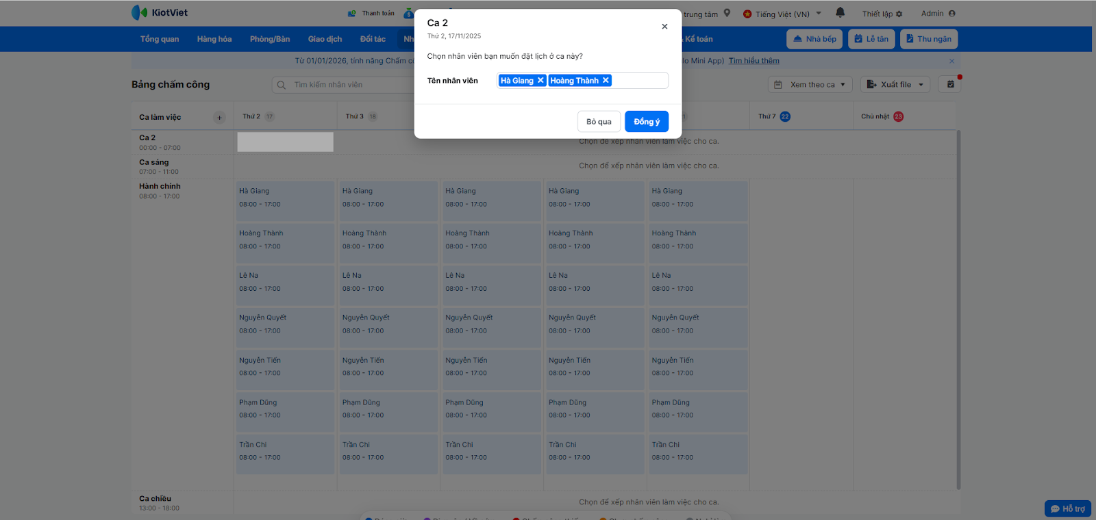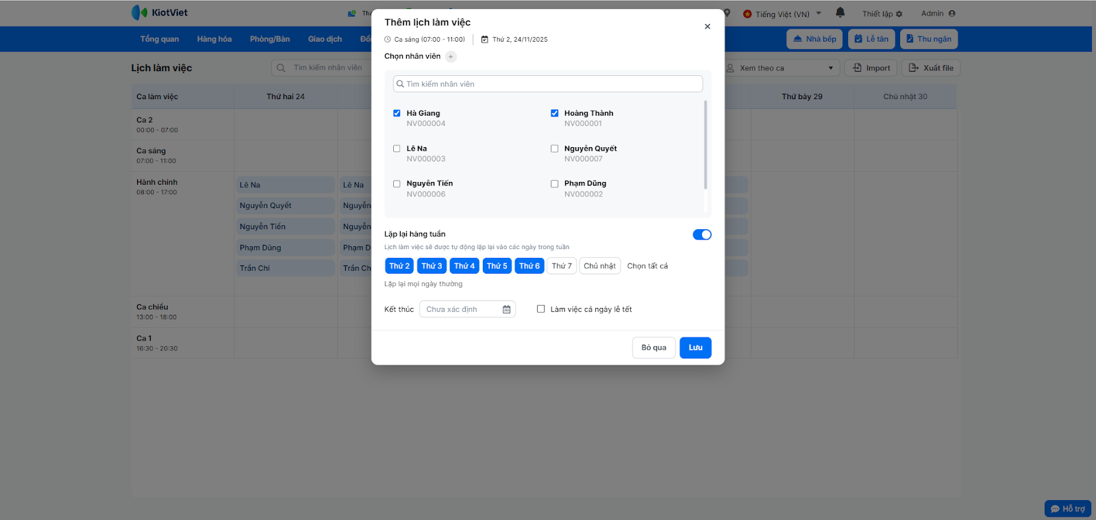 Sau khi có ca làm việc, bạn cần xếp lịch cho nhân viên.