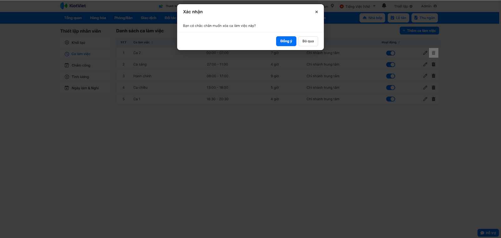 - Để Xóa ca, kích vào biểu tượng thùng rác