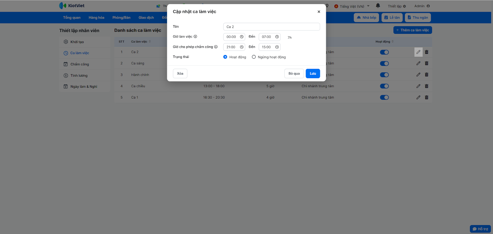 - Cập nhật / Ngừng hoạt động / Xóa ca làm việc: