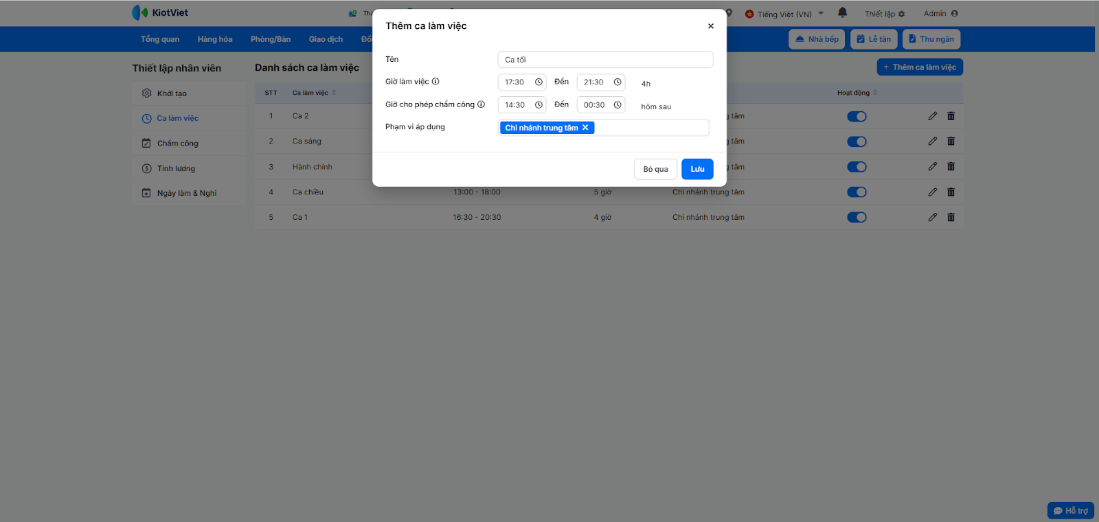 - Thêm ca làm việc: