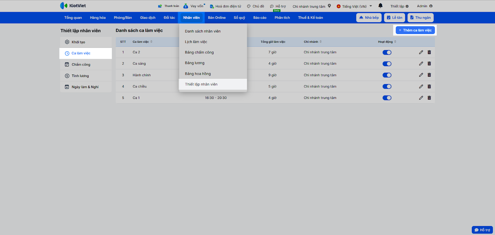 - Hệ thống hiển thị danh sách ca làm việc hiện có. Nhấn + Thêm ca làm việc.