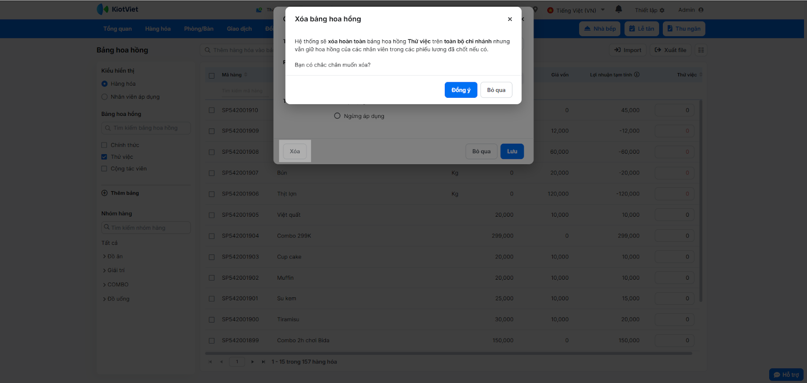 - Chọn Đồng ý để xác nhận xóa bảng hoa hồng.