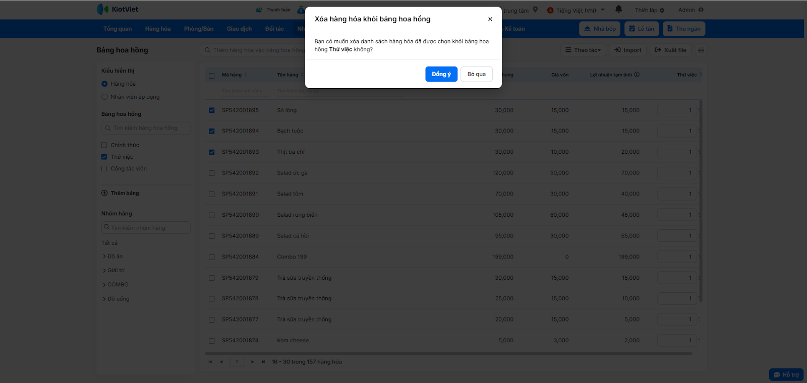 - Xóa món khỏi bảng hoa hồng: