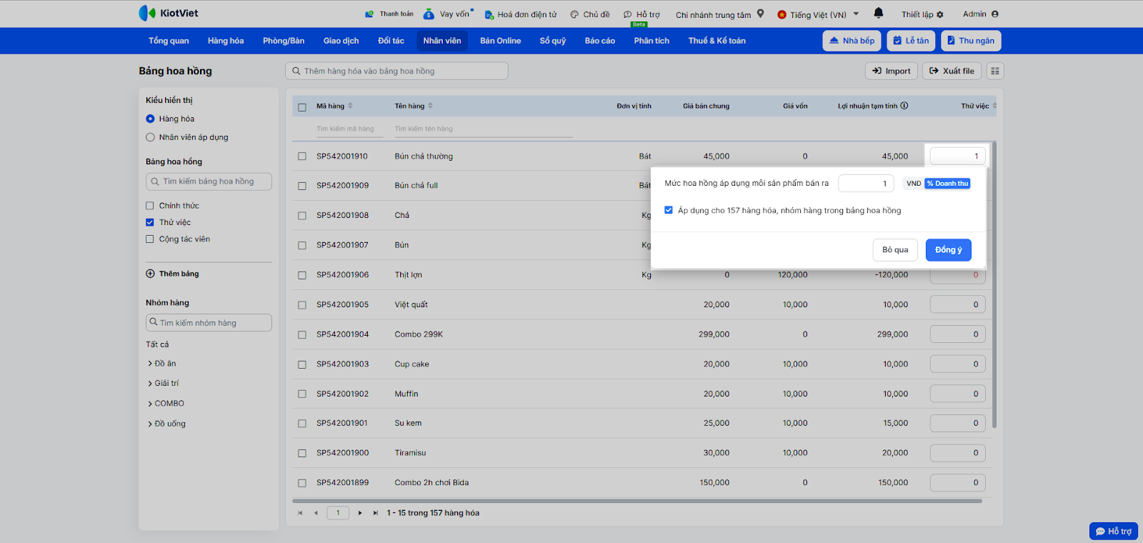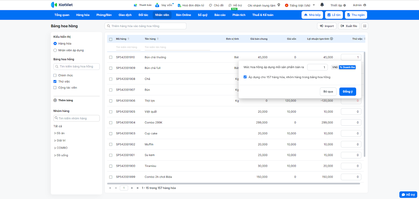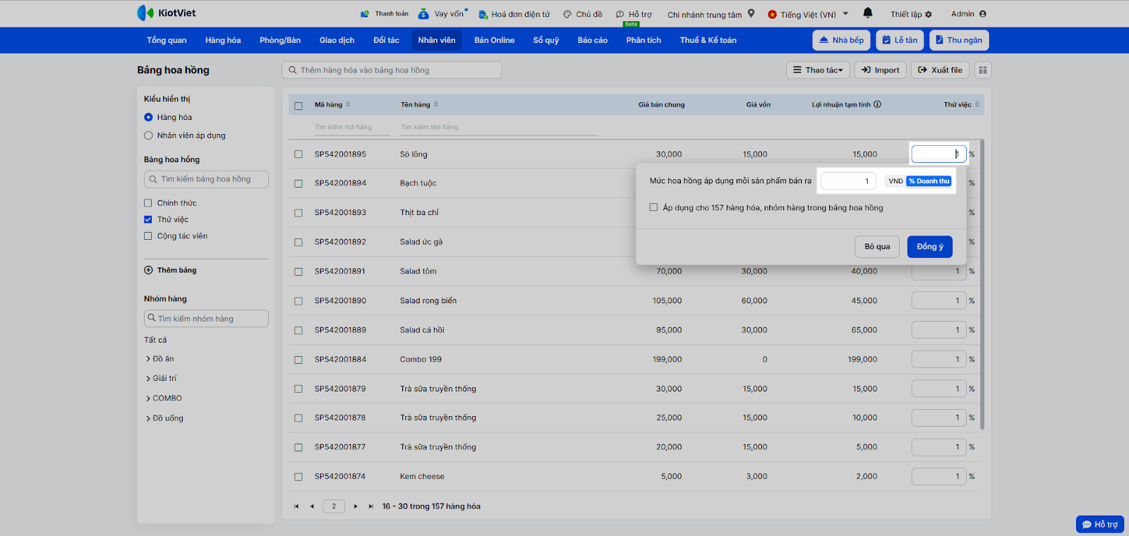 - Tính toán hoa hồng đa dạng: Hỗ trợ tính hoa hồng theo tỷ lệ phần trăm (%) doanh thu hoặc theo số tiền cố định (VNĐ) trên từng món ăn/đồ uống.