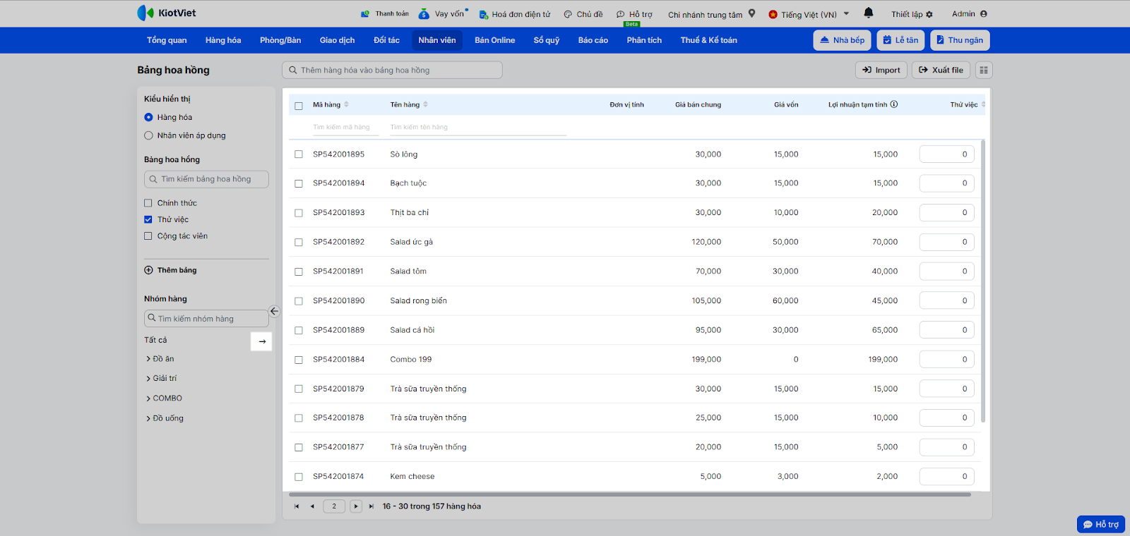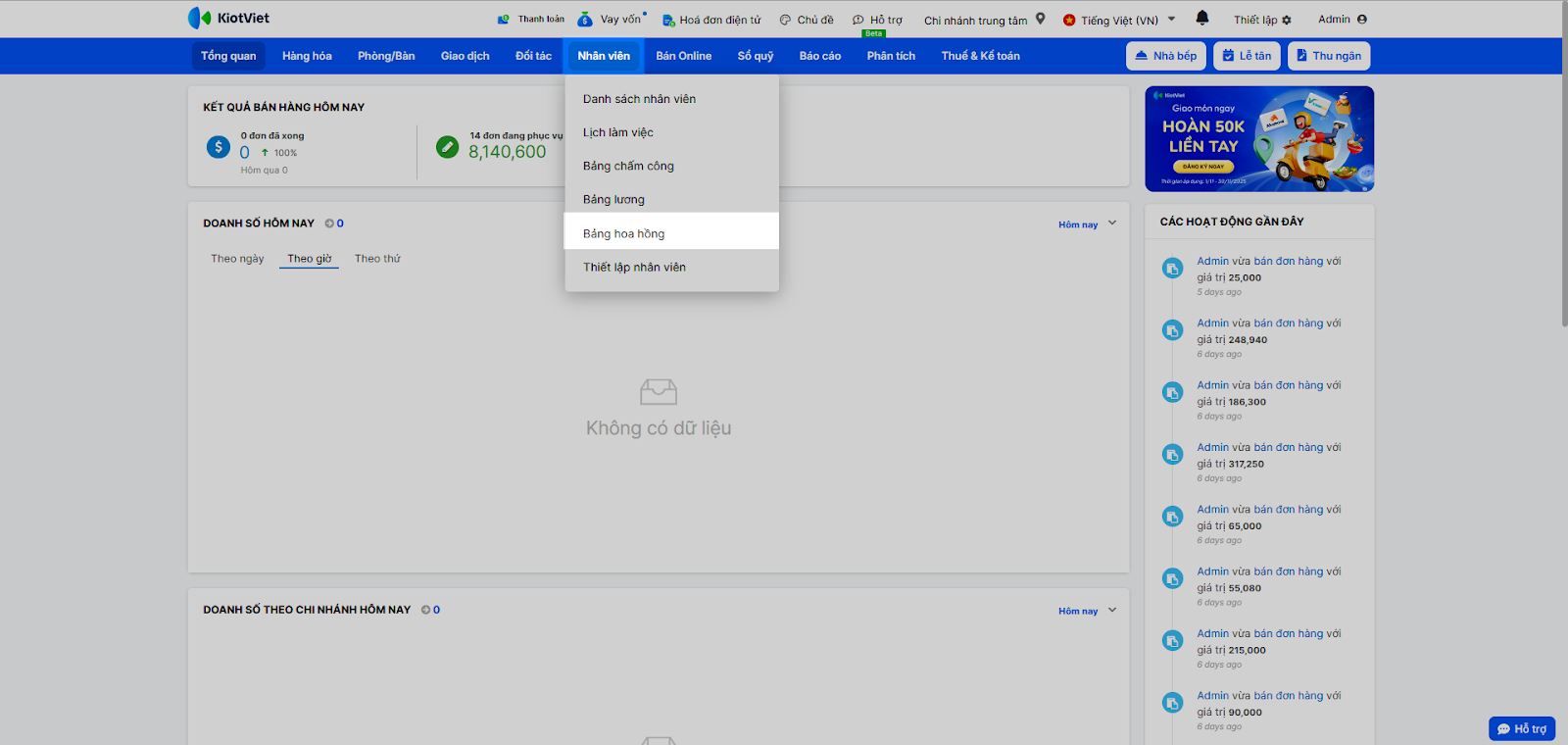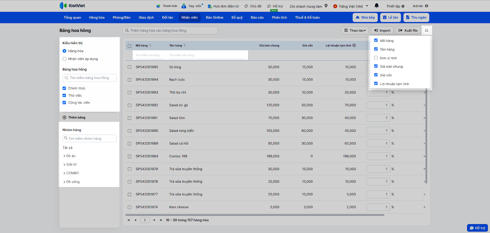 - Tính toán hoa hồng đa dạng: Hỗ trợ tính hoa hồng theo tỷ lệ phần trăm (%) doanh thu hoặc theo số tiền cố định (VNĐ) trên từng món ăn/đồ uống.