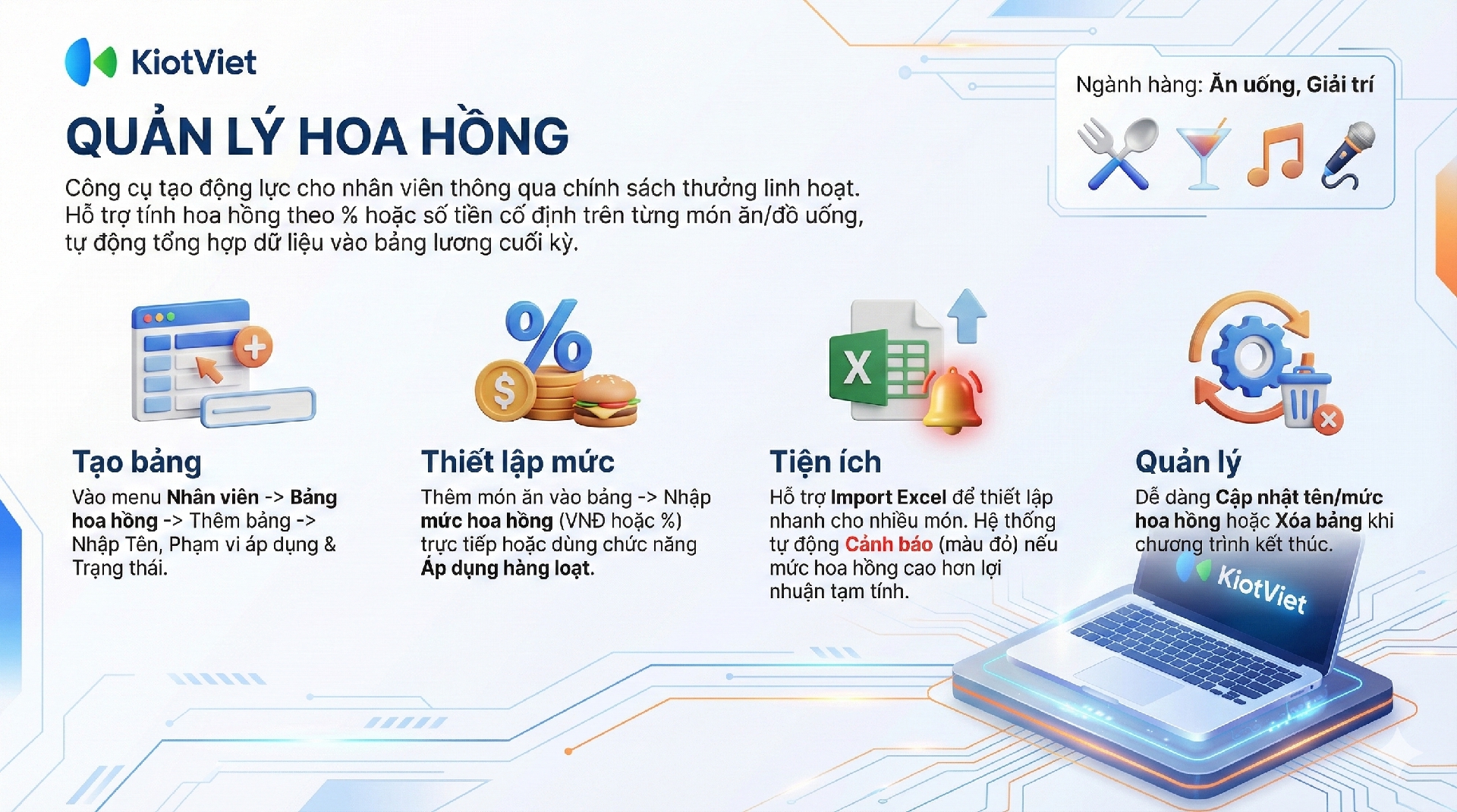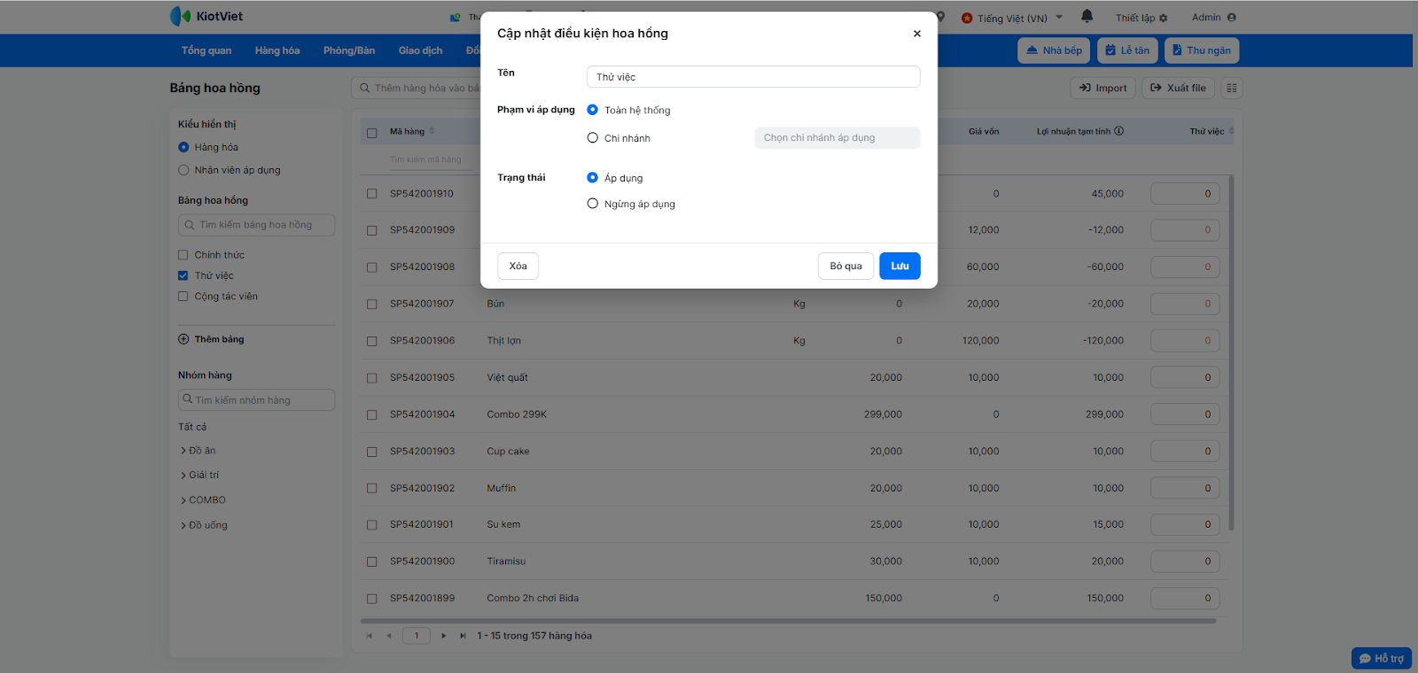 - Quản lý dễ dàng: Dễ dàng thêm mới, cập nhật, xóa bảng hoa hồng; thêm/xóa món; cập nhật mức hoa hồng hàng loạt hoặc theo từng món.