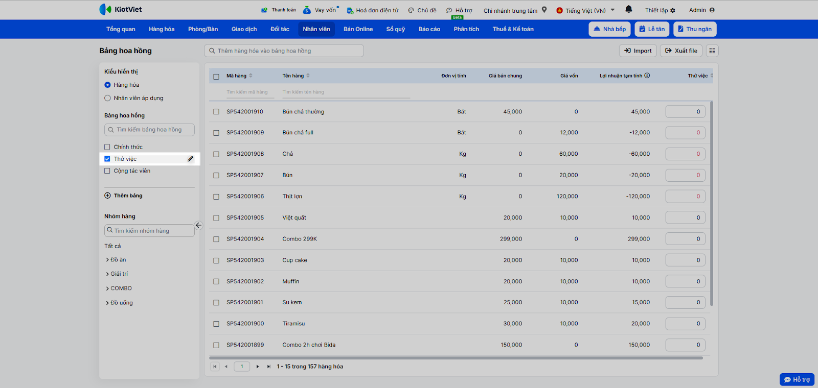 - Tình huống: Bạn cần xem lại các bảng hoa hồng hiện có và mức hoa hồng đang áp dụng cho các món ăn/đồ uống.