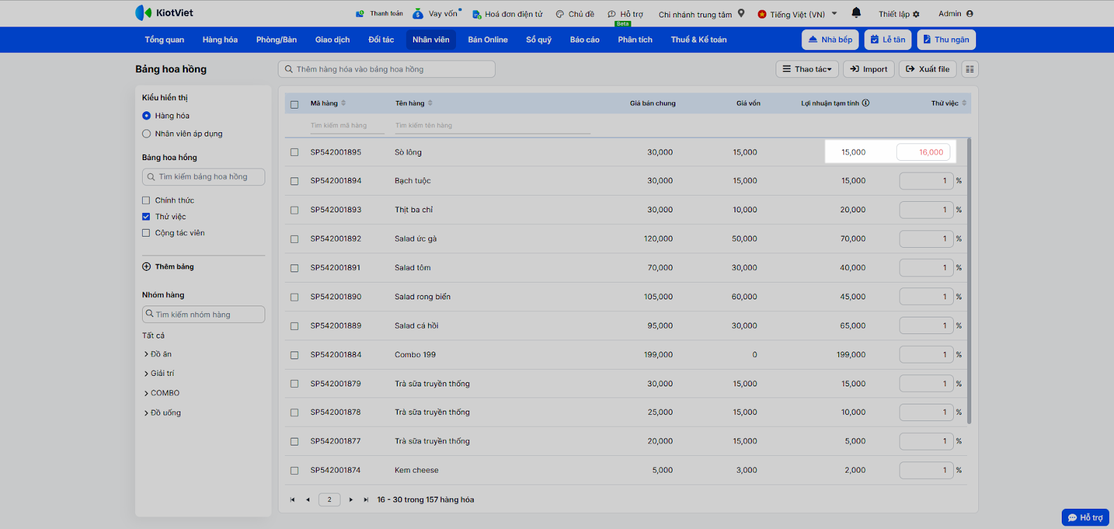 - Nhập trực tiếp: Click vào ô hoa hồng của từng món và nhập giá trị (% hoặc VNĐ). Hệ thống tự động lưu sau khi bạn thoát khỏi ô nhập liệu.
