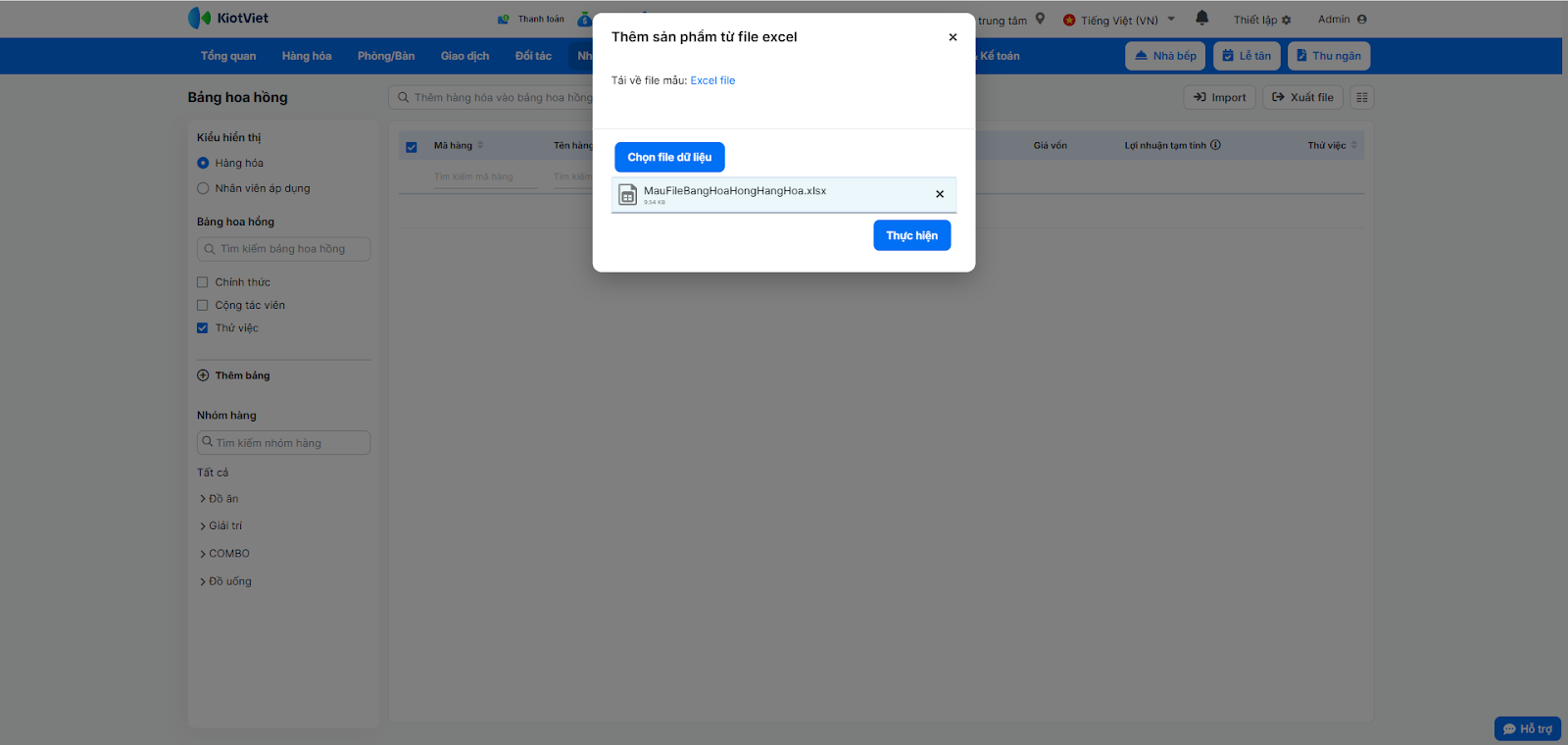 - Import từ file Excel: Nhấn nút Import, tải file mẫu về, điền thông tin (Mã món, mức hoa hồng theo % hoặc VNĐ cho từng bảng) và tải file lên. Hệ thống hỗ trợ import tối đa 5 bảng hoa hồng cùng lúc.