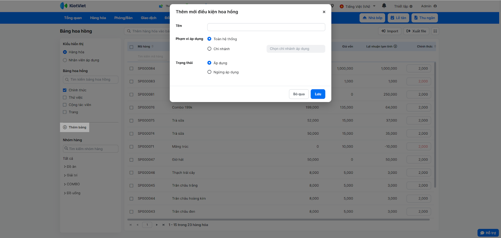 - Thêm món vào bảng: Sau khi lưu bảng hoa hồng, bạn cần thêm các món ăn/đồ uống: