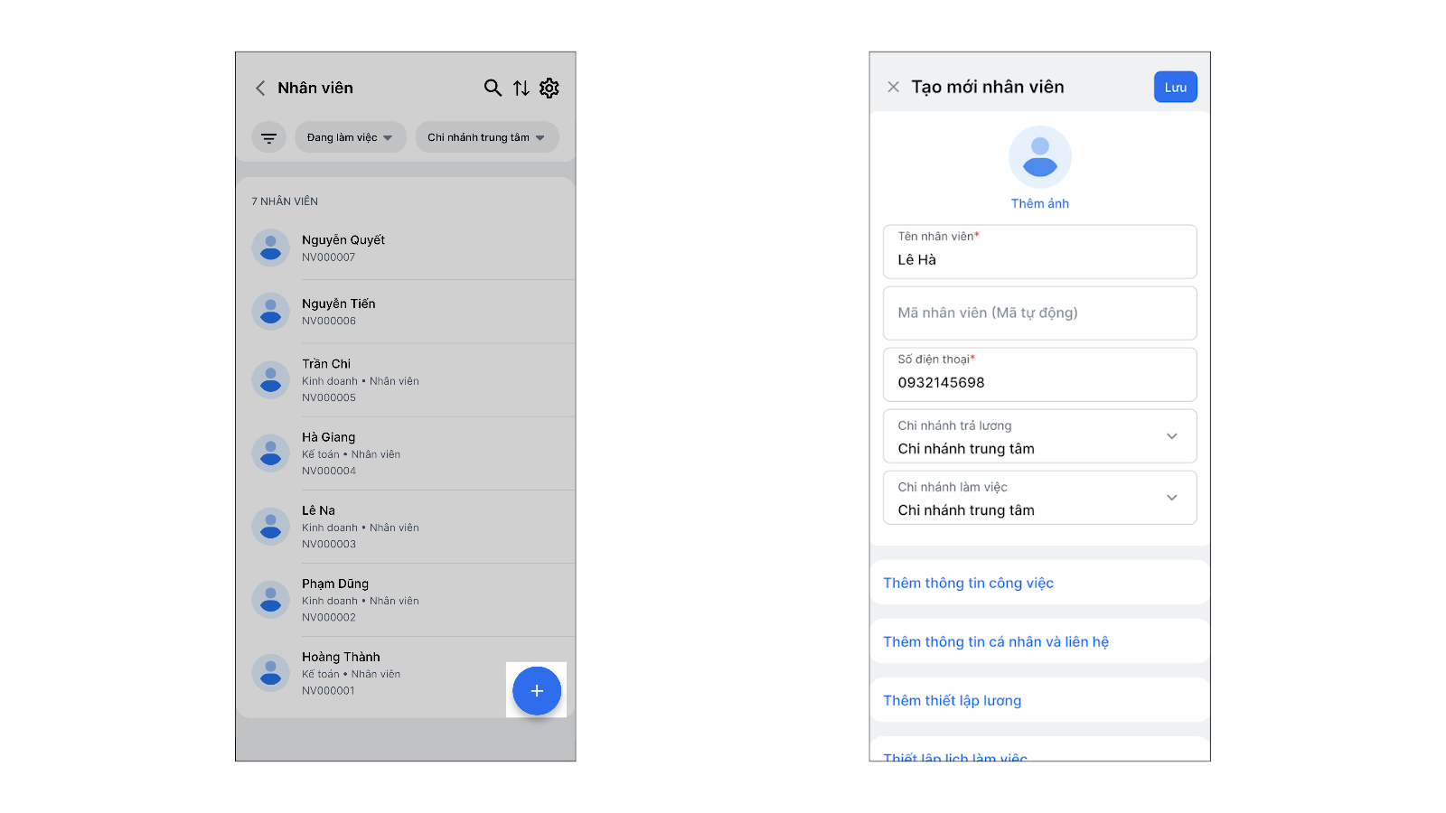 - Bắt buộc điền: Tên nhân viên, Số điện thoại, Chi nhánh trả lương, Chi nhánh làm việc.