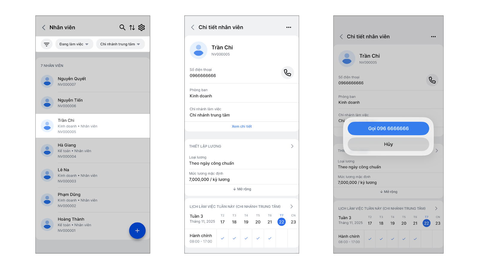 - Chạm vào một nhân viên để xem chi tiết. Ứng dụng hỗ trợ tiện ích kết nối nhanh qua số điện thoại.