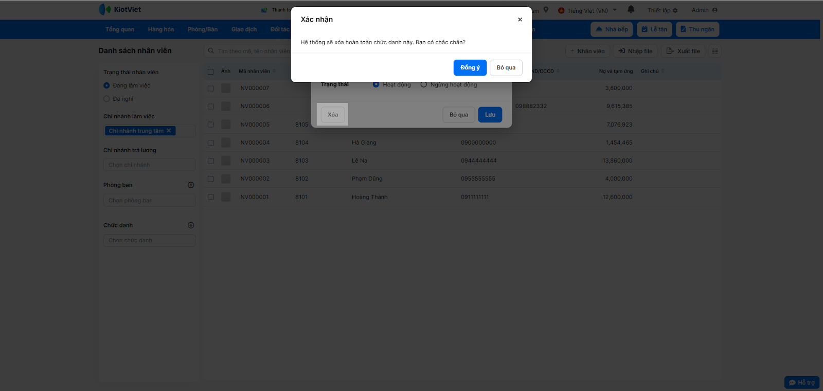 Lưu ý: Khi bạn bỏ chọn một hoặc nhiều chi nhánh làm việc của nhân viên đã có lịch làm việc tại chi nhánh đó, hệ thống sẽ hỏi xác nhận để xóa các lịch làm việc (chưa chấm công) tương lai tại chi nhánh bị bỏ chọn.