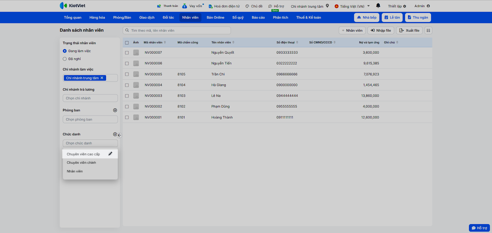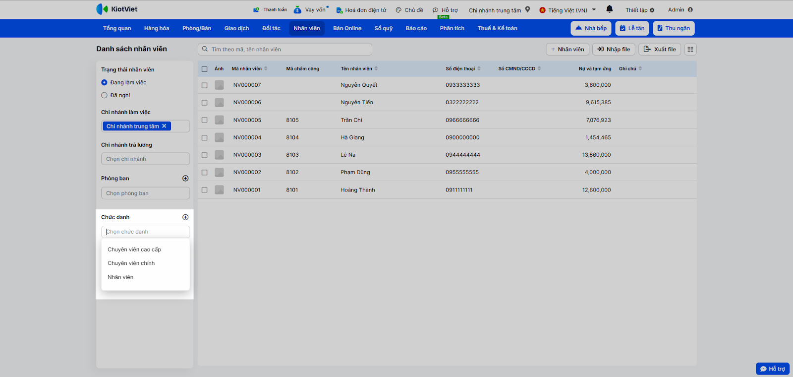 - Xem danh sách: Danh sách các chức danh hiển thị trong bộ lọc tại màn hình Nhân viên.
