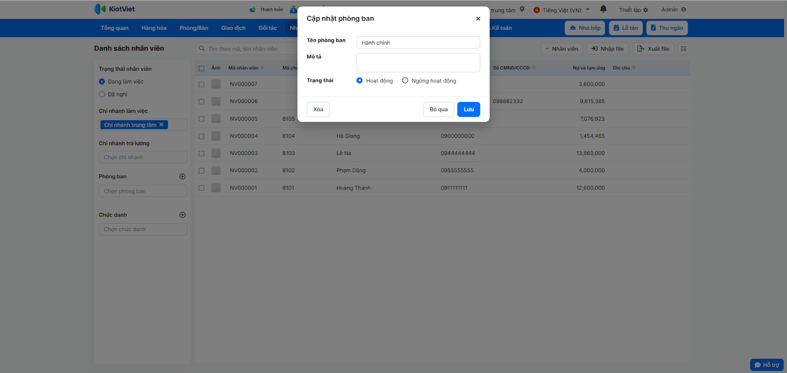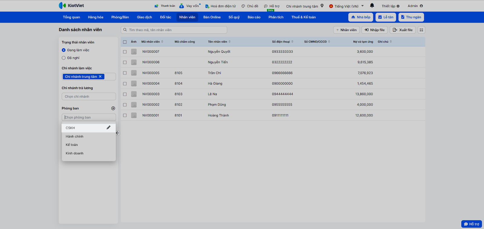 - Xem danh sách: Danh sách các phòng ban hiển thị trong bộ lọc tại màn hình Nhân viên.
