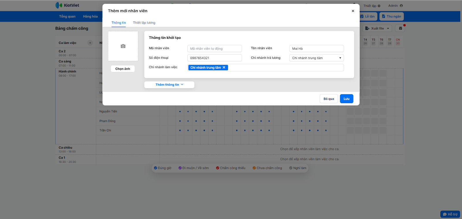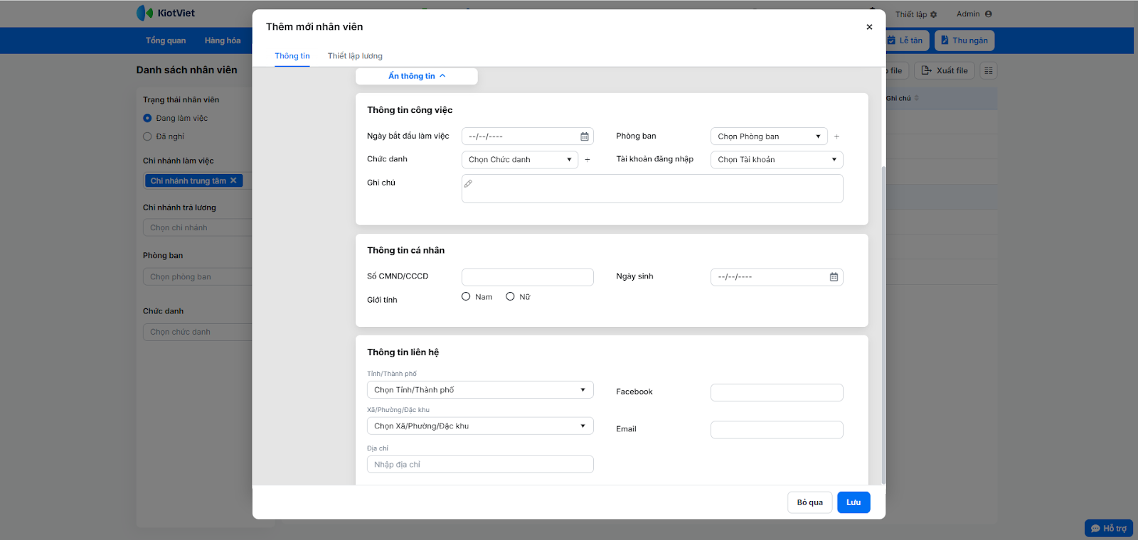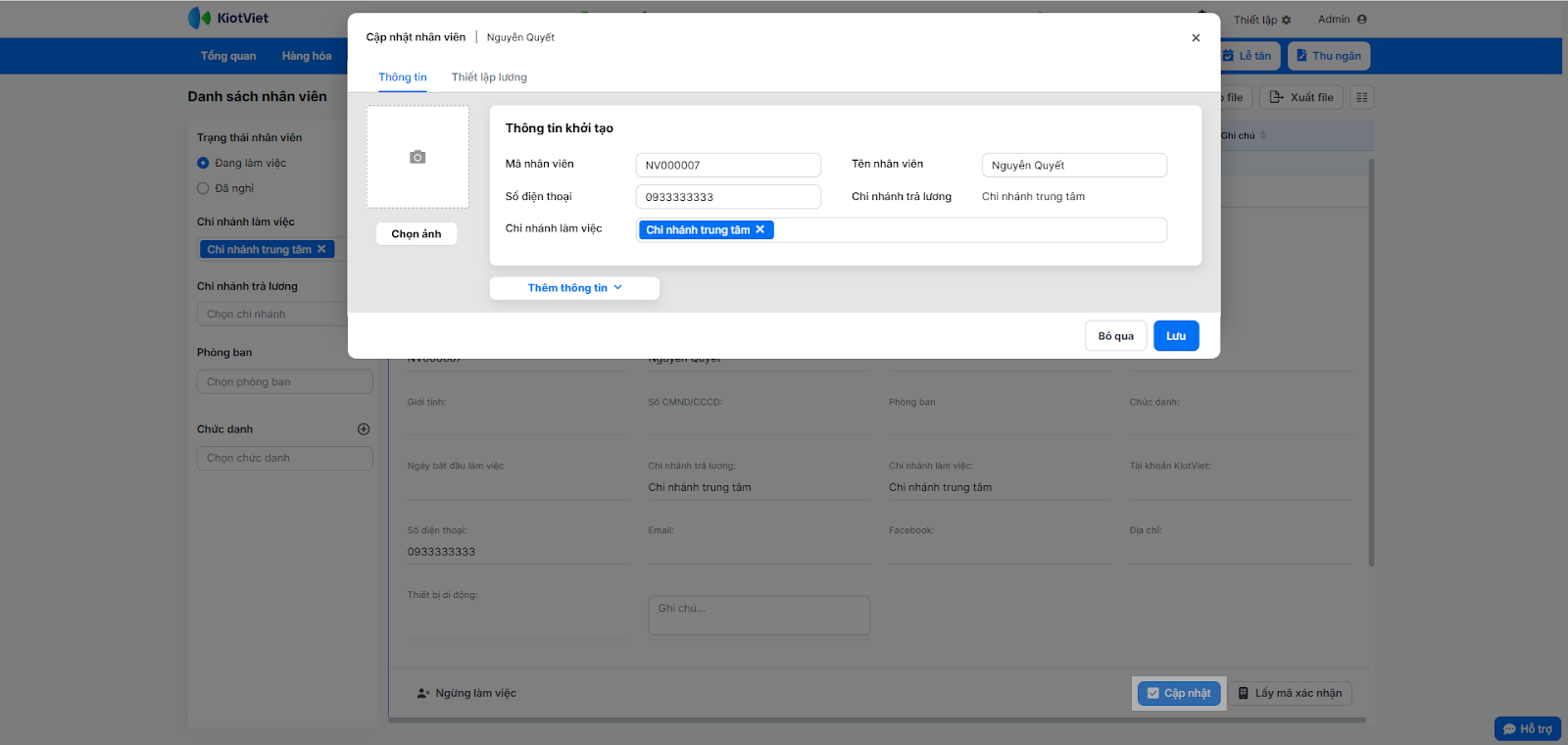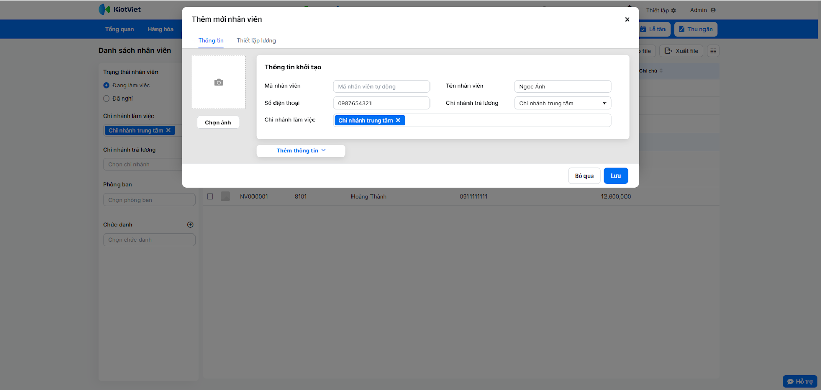 - Điền/ chọn các thông tin bắt buộc như: Tên nhân viên, Số điện thoại, Chi nhánh trả lương, Chi nhánh làm việc.