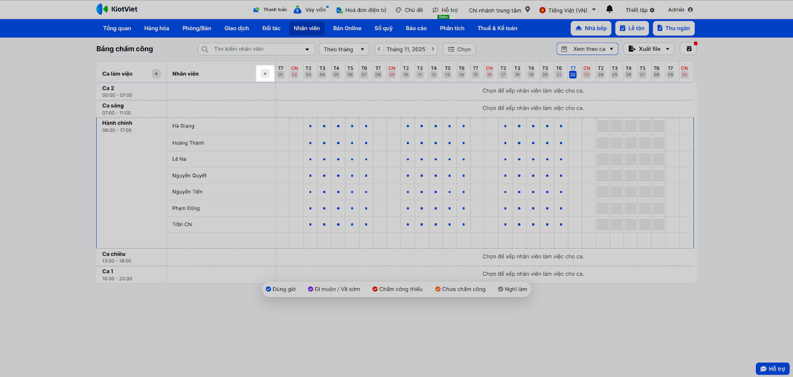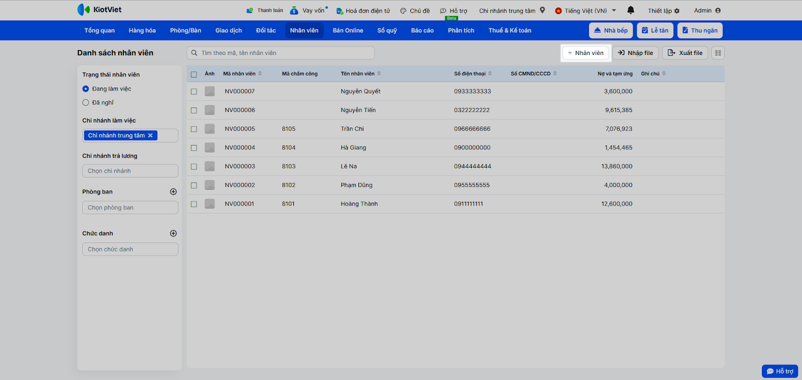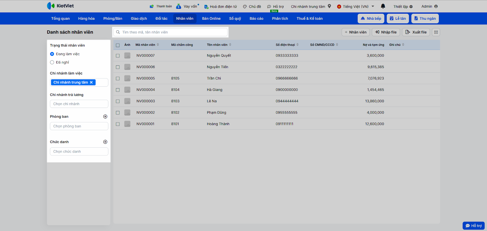 - Tại đây, bạn có thể chọn chi nhánh, trạng thái nhân viên, tìm kiếm theo tên/mã, hoặc dùng bộ lọc để tìm kiếm nhân viên.