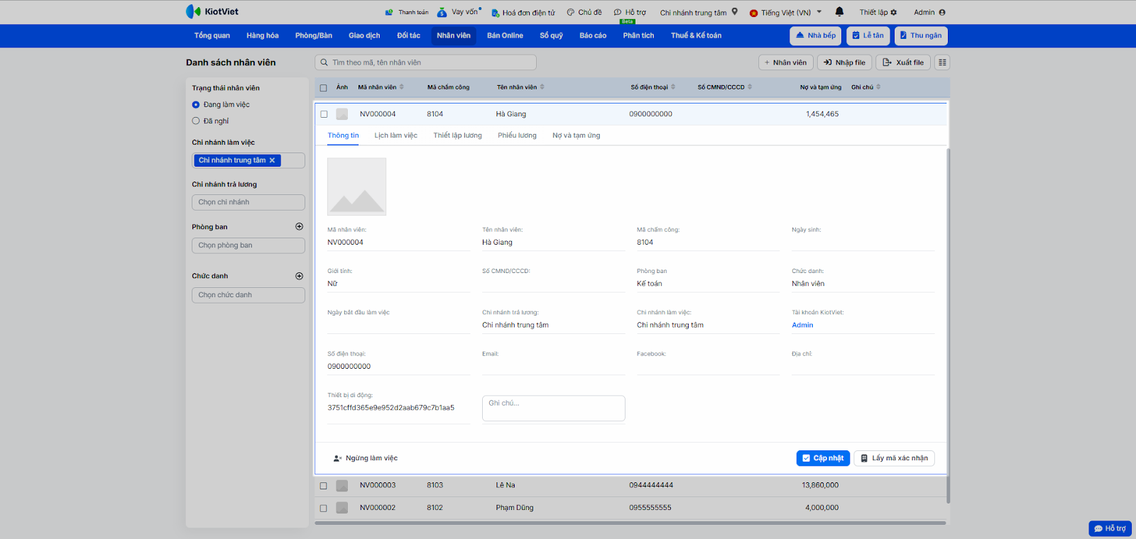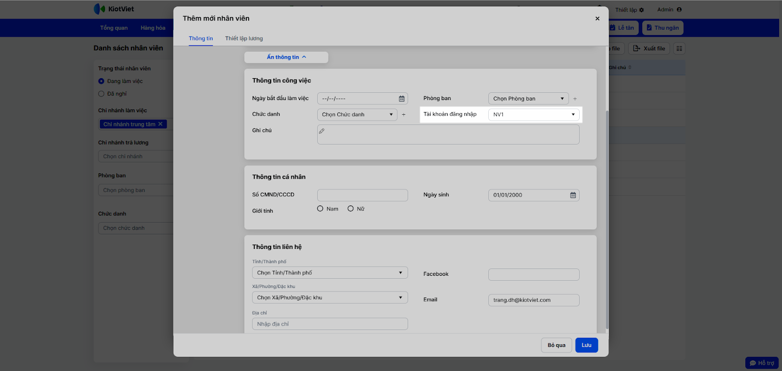 - Bạn có thể liên kết tài khoản KiotViet và bổ sung thông tin (Phòng ban, Chức danh, Ngày sinh…).