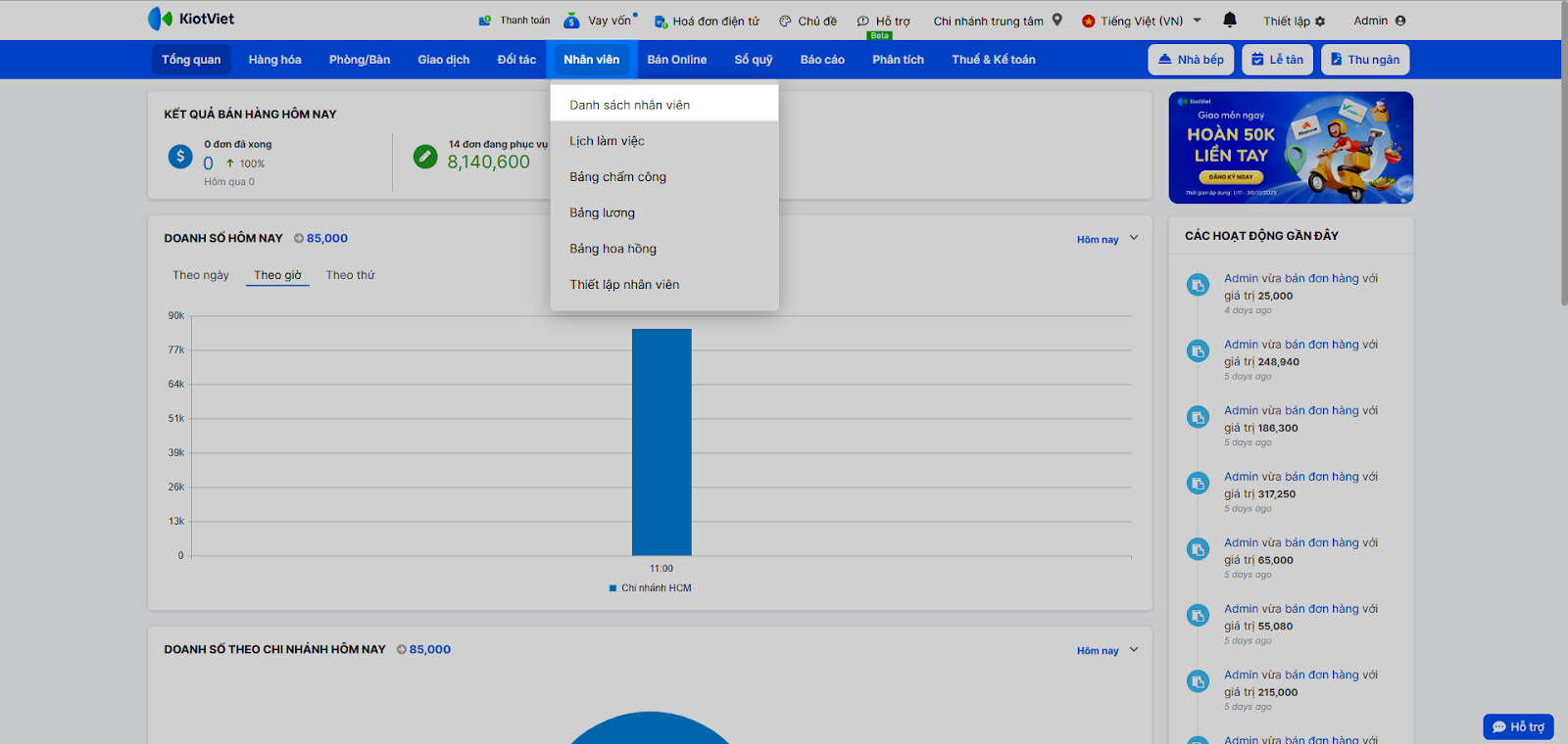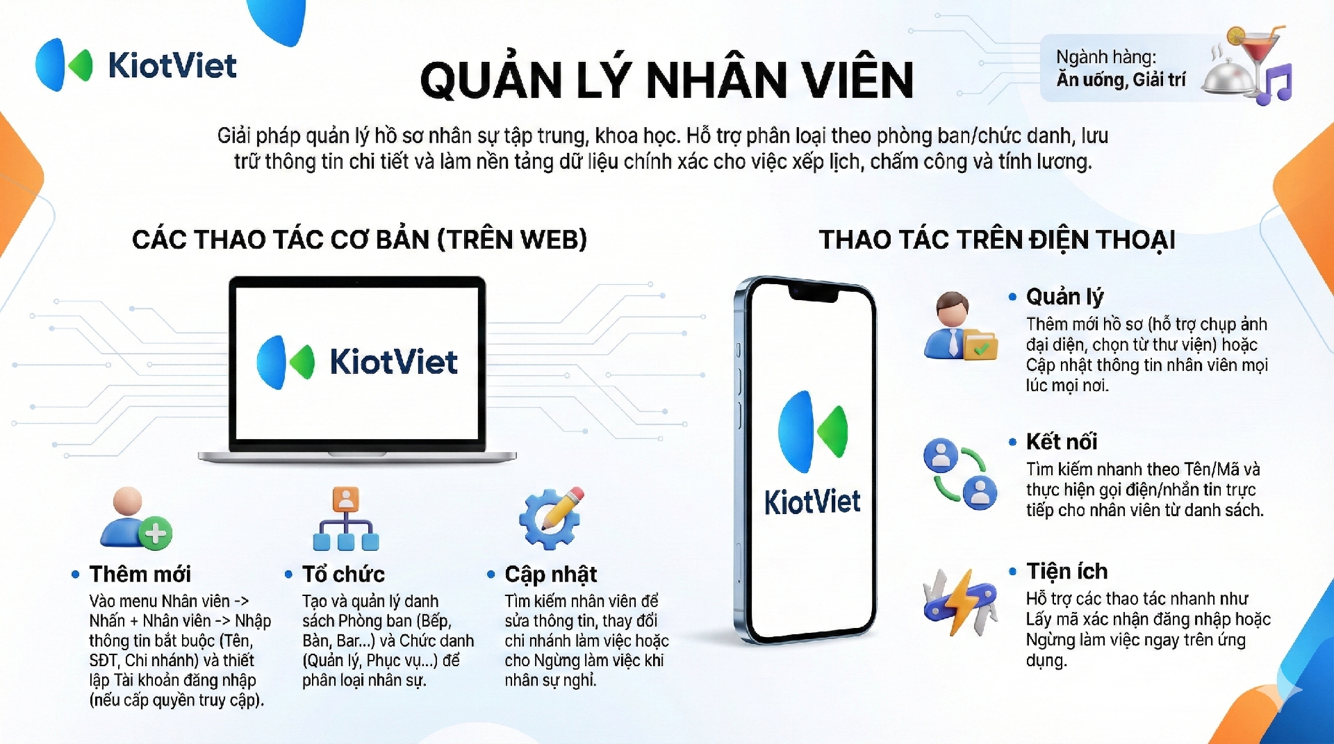 Tính năng Quản lý Nhân viên trên KiotViet giúp chủ nhà hàng/quán quản lý danh sách nhân viên một cách khoa học và chính xác. Việc ghi nhận đầy đủ thông tin nhân viên, bao gồm phòng ban và chức danh, là nền tảng quan trọng cho các nghiệp vụ quản lý nhân sự khác như xếp lịch làm việc, chấm công và tính lương.