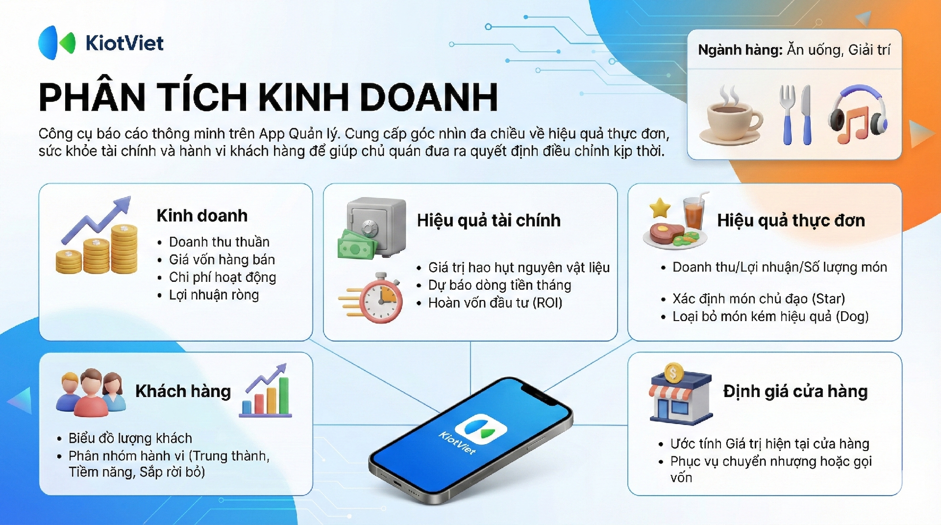 Tính năng Phân tích (Báo cáo kinh doanh thông minh) trên ứng dụng KiotViet Quản lý Nhà hàng giúp chủ quán dễ dàng khai thác và nắm bắt chuyên sâu tình hình kinh doanh thông qua các số liệu đa góc nhìn. Từ đó, người quản lý có thể phát hiện sớm các vấn đề tồn đọng và đưa ra quyết định điều chỉnh hiệu quả.