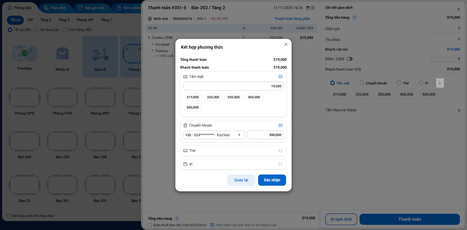. - Một cửa sổ sẽ hiện ra, cho phép bạn tích chọn và nhập số tiền tương ứng với từng hình thức thanh toán (Tiền mặt, Chuyển khoản, Thẻ, Ví). Sau khi nhập đủ số tiền khách cần trả, nhấn Xác nhận và nhấn Thanh toán để kết thúc.
