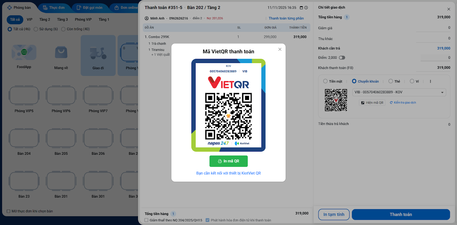- Bạn có thể cho khách quét mã trực tiếp trên màn hình, in mã QR lên phiếu tạm tính, hoặc hiển thị mã qua thiết bị KiotViet QR.