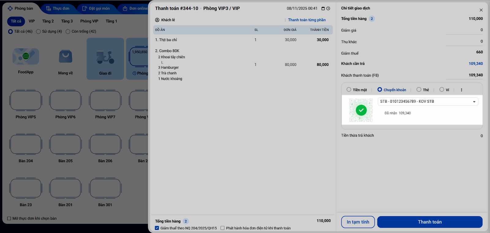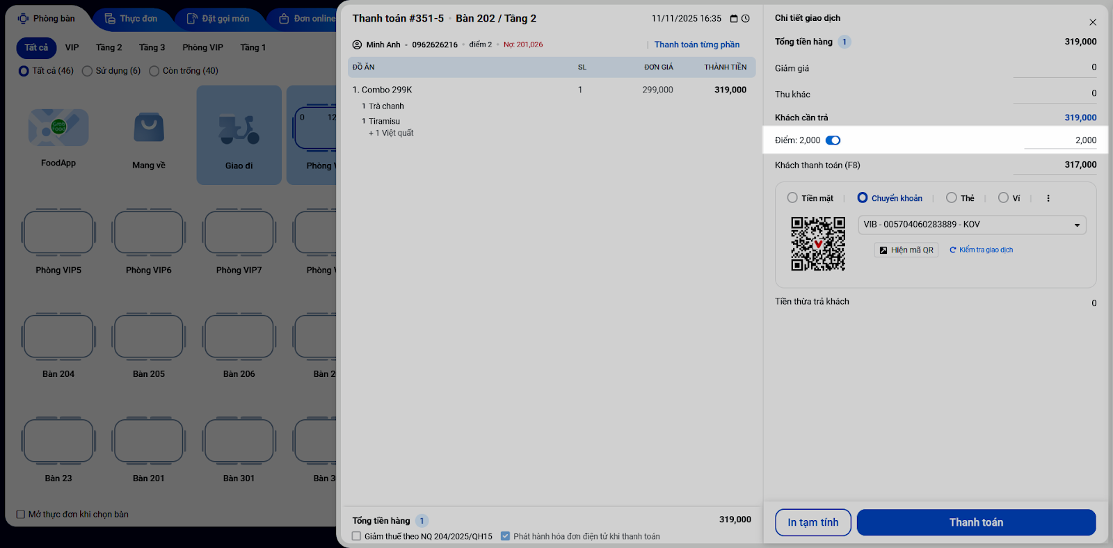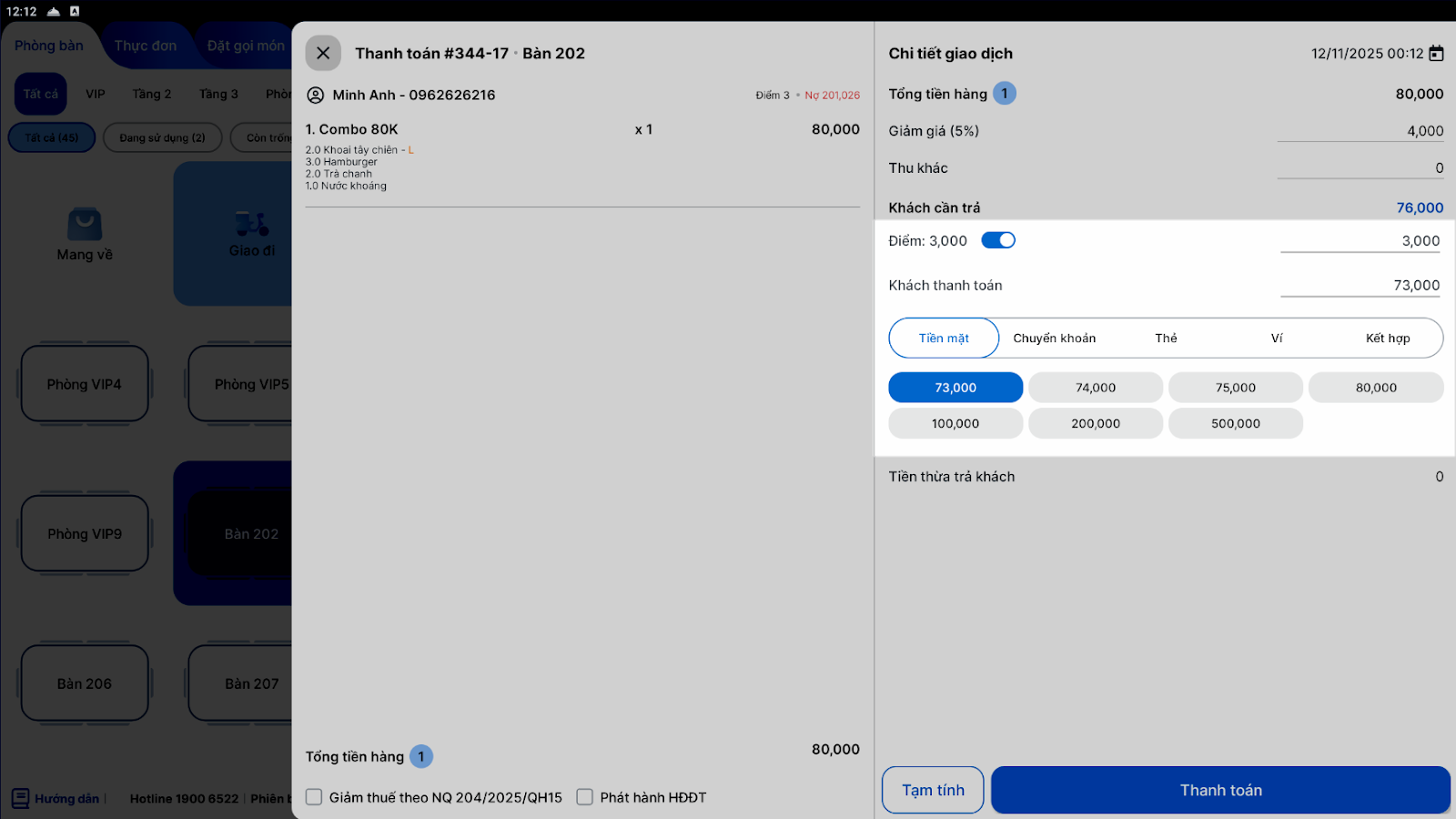 - Nhấn Thanh toán để hoàn tất giao dịch và in hóa đơn.