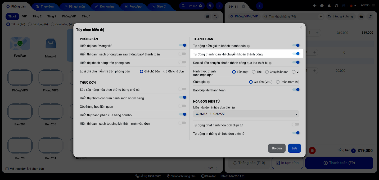 - Bật xanh tính năng Tự động thanh toán khi chuyển khoản thành công. Khi khách quét mã QR và thanh toán thành công, hệ thống sẽ tự động thanh toán hóa đơn.