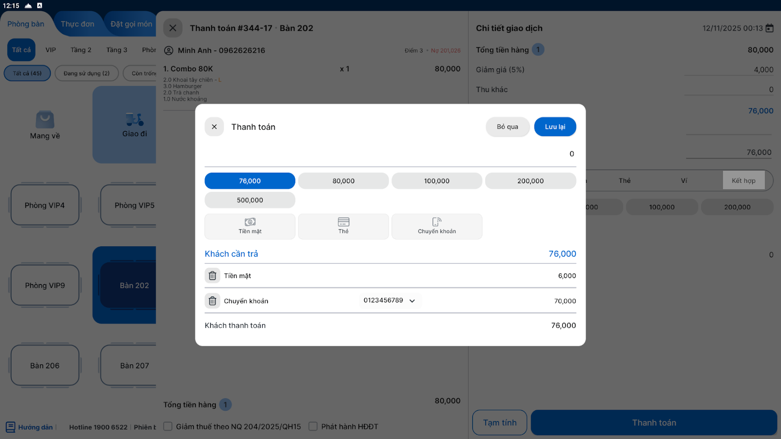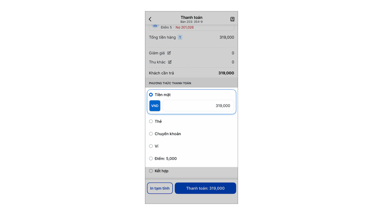 - Để thanh toán nhiều phương thức, chạm vào dòng Khách thanh toán để mở màn hình chi tiết và phân bổ số tiền cho từng hình thức.