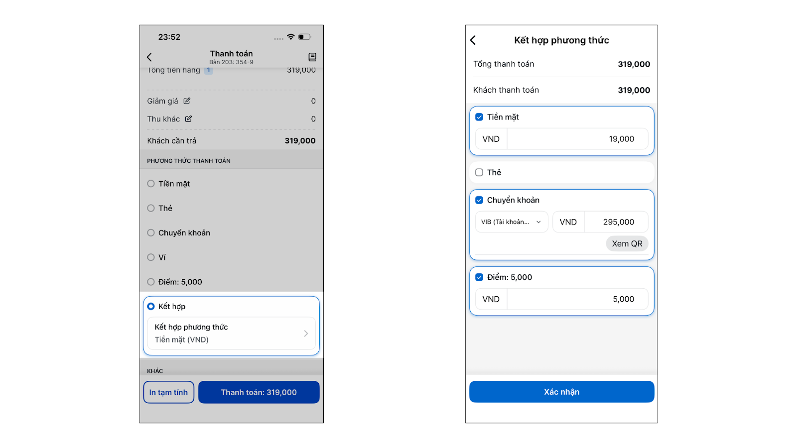- Chạm vào hình thức Kết hợp → chọn Kết hợp phương thức để mở màn hình chi tiết và phân bổ số tiền cho từng hình thức (Tiền mặt, Chuyển khoản, Thẻ, Ví) → chạm Xác nhận.